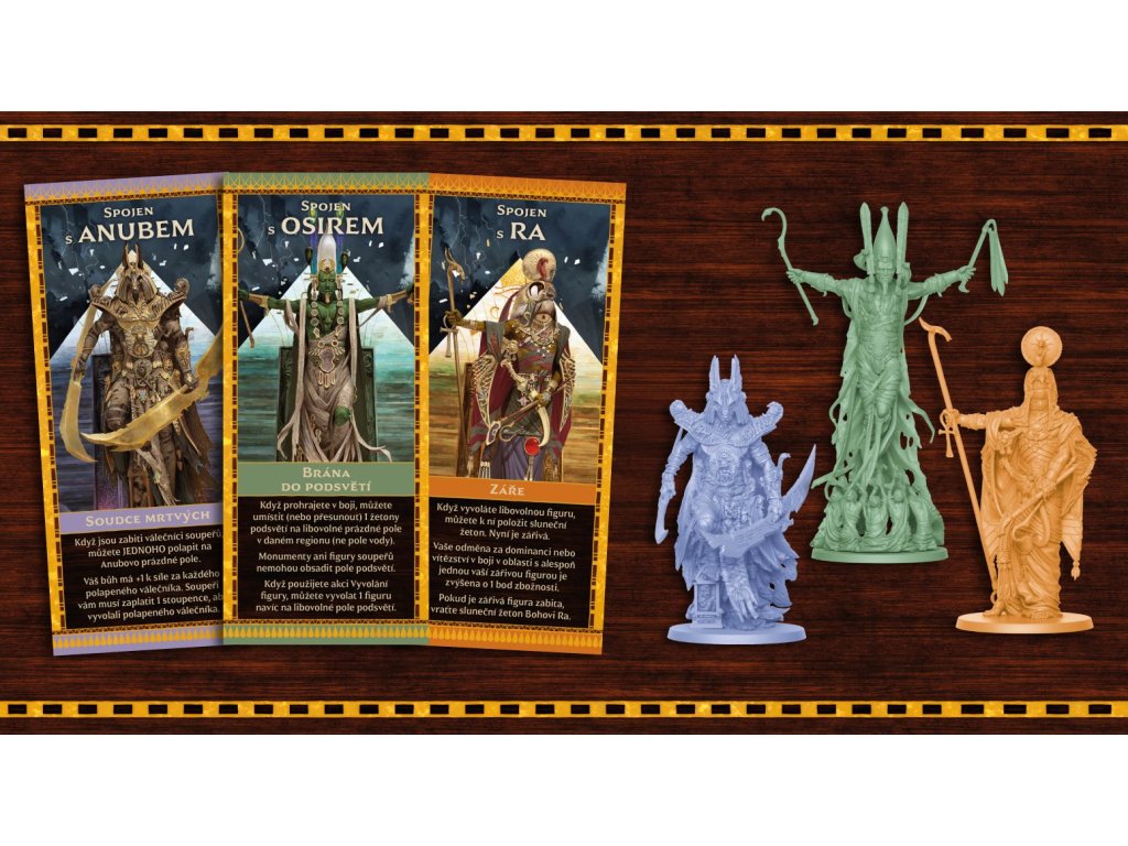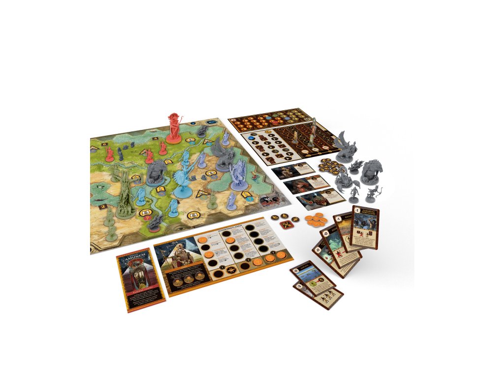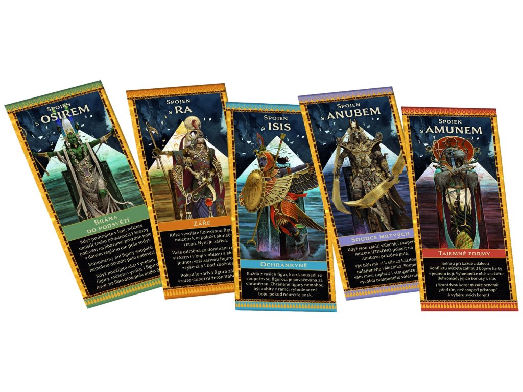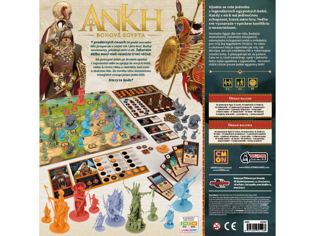 žetonů Ankh o 1 plastový drahokam o 1 hrací plán o 2 hlavní desky o 10 desek bohů o 46 karet o 197 žetonů