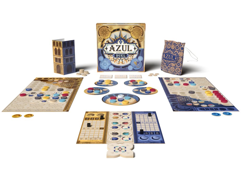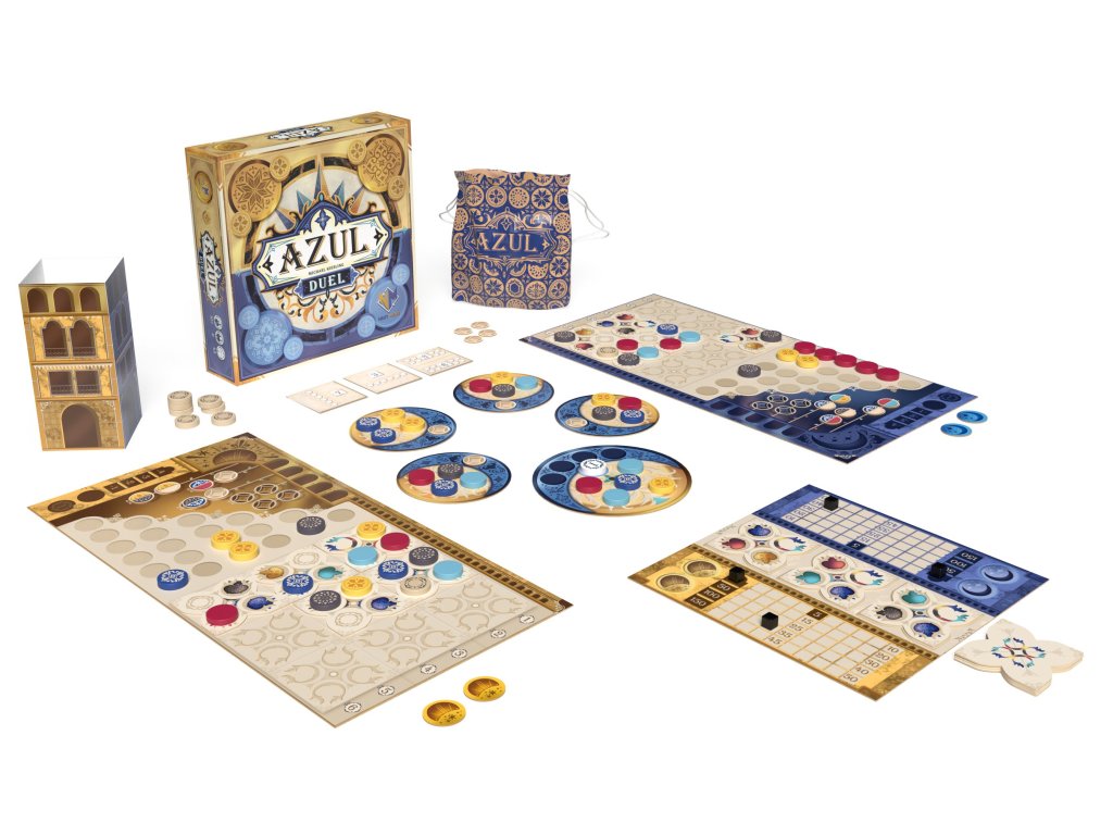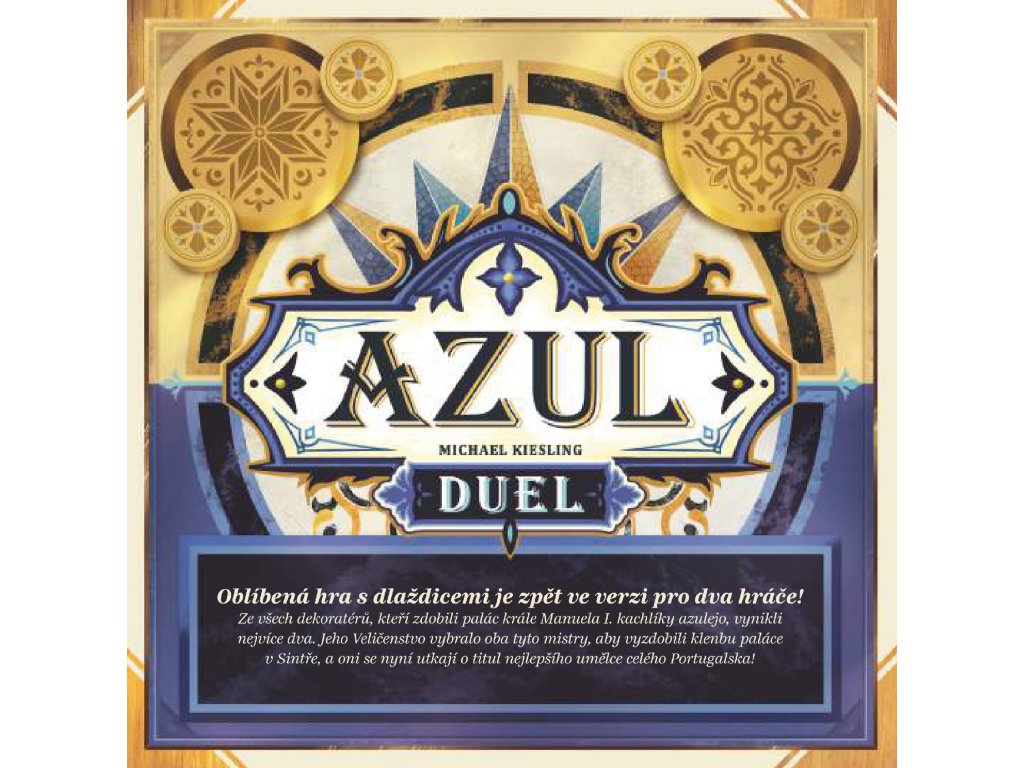 Ze všech dekoratérů, kteří zdobili palác krále Manuela I. kachlíky azulejo, vynikli nejvíce dva. Jeho Veličenstvo vybralo oba tyto mistry, aby vyzdobili klenbu paláce v Sintře a oni se nyní utkají o titul nejlepšího umělce celého Portugalska!Hra Azul Duel je speciálně navržena pro dva hráče. Přináší nové herní prvky nabízející více taktických možností než původní hra Azul. Vyzdobte klenbu paláce v Sintře destičkami výzdoby a kulatými dlaždicemi. Pokládejte dlaždice ve vámi zvoleném pořadí a vytvářejte nabídky, jež váš soupeř nebude moci odmítnout. Vyzvěte svou rodinu a přátele na souboj o nejlepšího umělce celého Portugalska!
