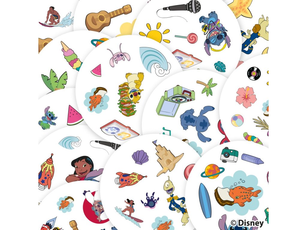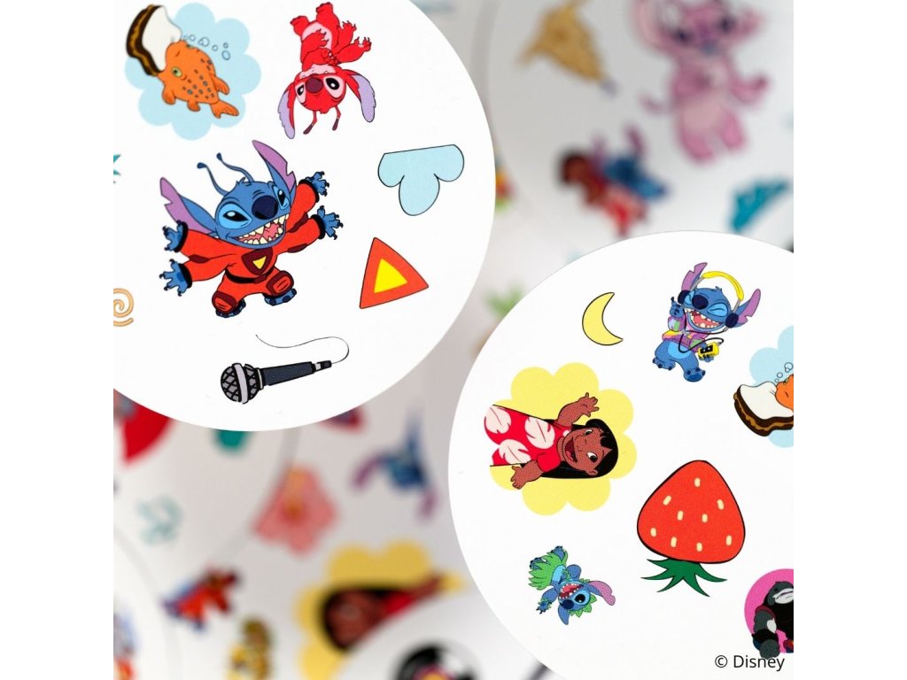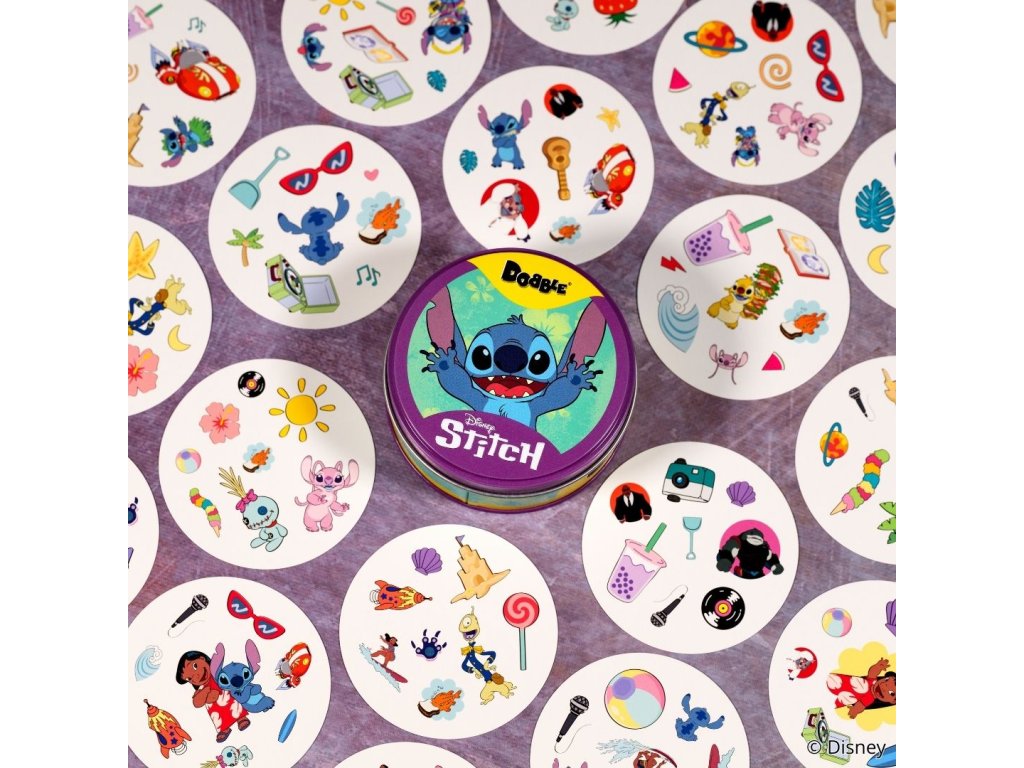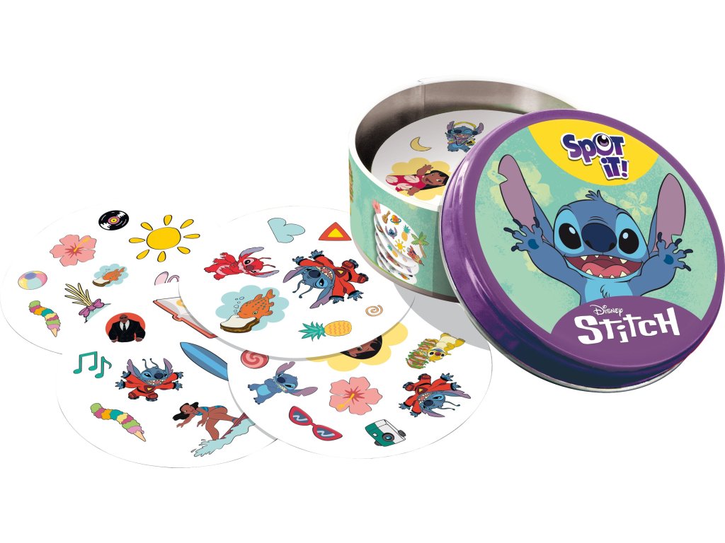 Užijte si oblíbenou postřehovou zábavu s postavičkami a ikonickými předměty z Disney Lilo a Stitch! Na každé kartě jich najdete 8 různých. Máte rádi Stitche? Pak je tahle hra přímo pro vás! Zahrajte si s ním a dalšími postavami (Lilo, Scrump, Angel…) oblíbenou postřehovou hru Dobble! Hra je zaměřená na rychlost, postřeh a reflexy! Popis všech symbolů použitých ve hře najdete v pravidlech.Hráči hledají dva stejné symboly na kartách při různých verzích hry (v pravidlech je popsáno celkem 5 her). Super jsou kulaté karty i jednoduchá pravidla vysvětlená doslova za pár sekund. Plechová krabička zaručuje bezpečí karet a jednoduše umožňuje mít hru vždy u sebe. Vyzkoušejte i Vy postřehový fenomén Dobble a jistě budete překvapeni, jak i tak jednoduchá hra může být zábavná a zároveň naučná!