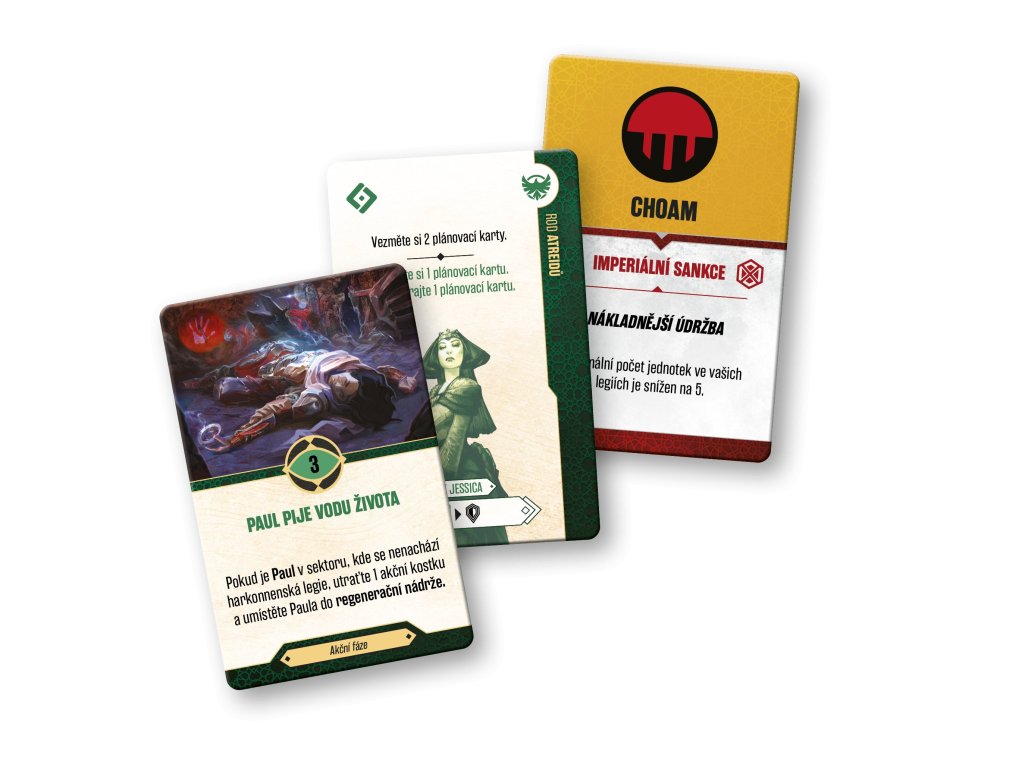 V této asymetrické hře musí rod Harkonnenů se svými vojáky ovládnout Arrakis, protože kdyby koření přestalo proudit, ztratili by podporu mocností uvnitř Impéria. Mezitím Paul Muad‘Dib, mladý atreidský vůdce a mesiáš, musí vést fremenské vzbouřence a skrze své jasnozřivé vize najít cestu k osudu Arrakisu, nevyhnutelnému džihádu a budoucnosti, kde se stane Kwisatz Haderachem. Zatímco Harkonnenové se spoléhají na svou techniku jako ornitoptéry a karyoly, Atreidové si podmanili sílu pouště a do bitvy jezdí na obrovských písečných červech. Každá frakce používá odlišnou strategii postavenou na unikátních velitelích a sadě plánovacích karet, aby