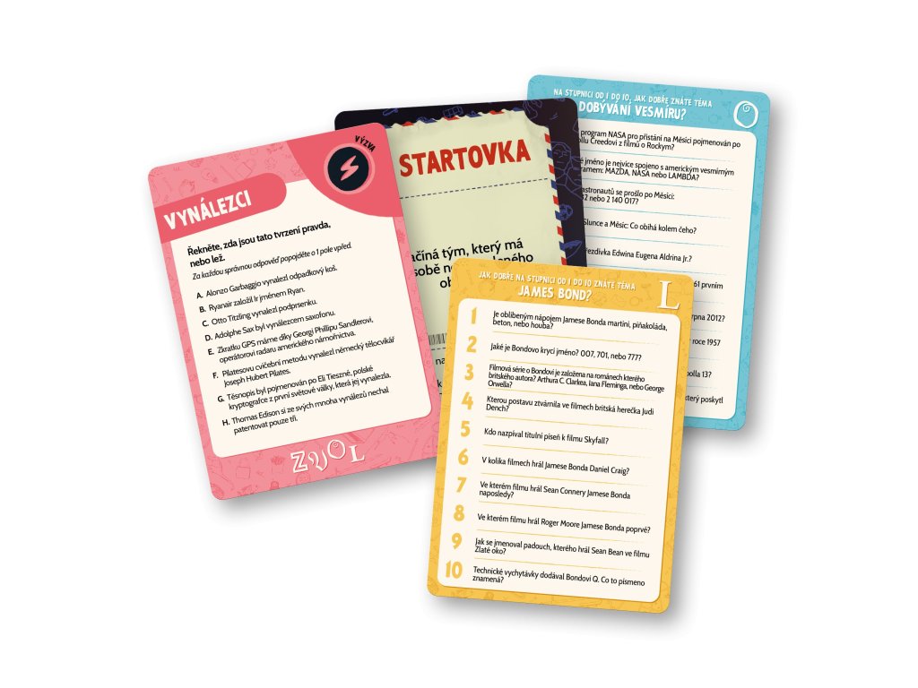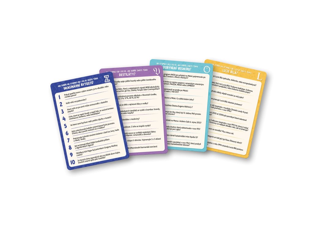 Tyto karty jsou rozdělené do 4 kategorií a každá z nich obsahuje témata, jejichž znalost musí týmy ohodnotit na stupnici od 1 do 10.
