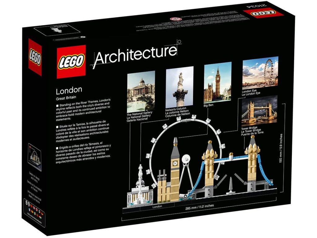 Oslav architektonickou rozmanitost města Londýn díky tomuto detailnímu LEGO® modelu z kostek. Panoramatická sbírka LEGO® Architecture obsahuje modely, které jsou vhodné k vystavení doma nebo v kanceláři. Byla vyvinuta pro všechny, kdo mají rádi cestování, architekturu, historii a design. Každá sada má své měřítko, aby byla přesnou verzí každé z budov v menší velikosti. Tato sada obsahuje Národní galerii, Nelsonův sloup, vyhlídkové Londýnské oko, věž Big Ben (tzv. Alžbětinu věž) a most Tower Bridge, navíc je doplněna o ozdobnou cedulku s nápisem „Londýn“.