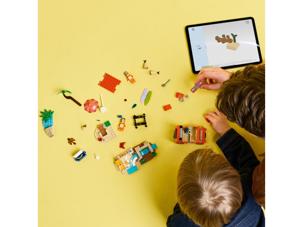 - Interaktivní stavebnice pro děti – Tato zábavná stavebnice obsahuje minifigurky LEGO®, autíčko a spoustu kreativních aktivit pro zábavný den na pláži s Bluey, Bingo a jejich maminkou