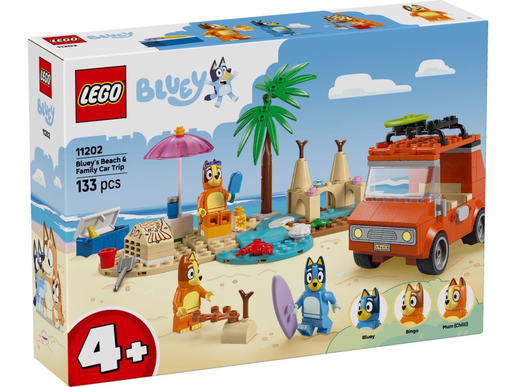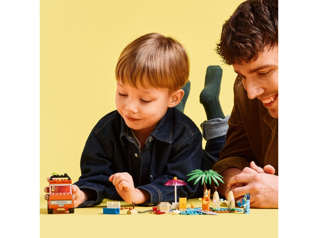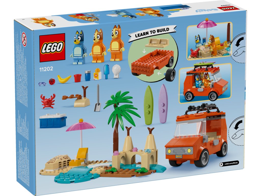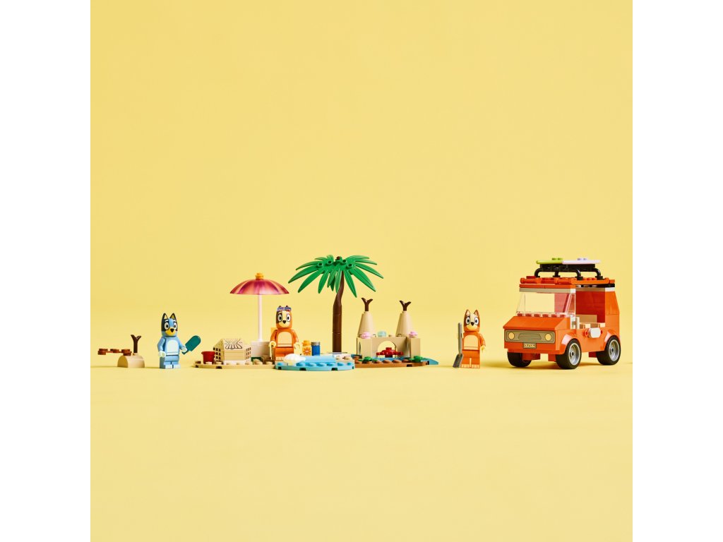 Tato stavebnice LEGO® obsahuje milované vozidlo z televizního seriálu Bluey se 2 surfovacími prkny připevněnými na střeše a kufrem na uložení chladicího boxu. Vyklápěcí střecha auta umožňuje dětem snadný přístup do interiéru, kde jsou sedadla pro minifigurky Bluey, Bingo a Chilli (maminky Bluey). Mezi plážové prvky, které inspirují děti ke kreativnímu hraní, patří působivý hrad z písku, ocas mořské panny z písku, do kterého se vejde minifigurka, lehátko, slunečník a palma. Nechybí krab, zmrzlina, sluneční brýle a opalovací krém.