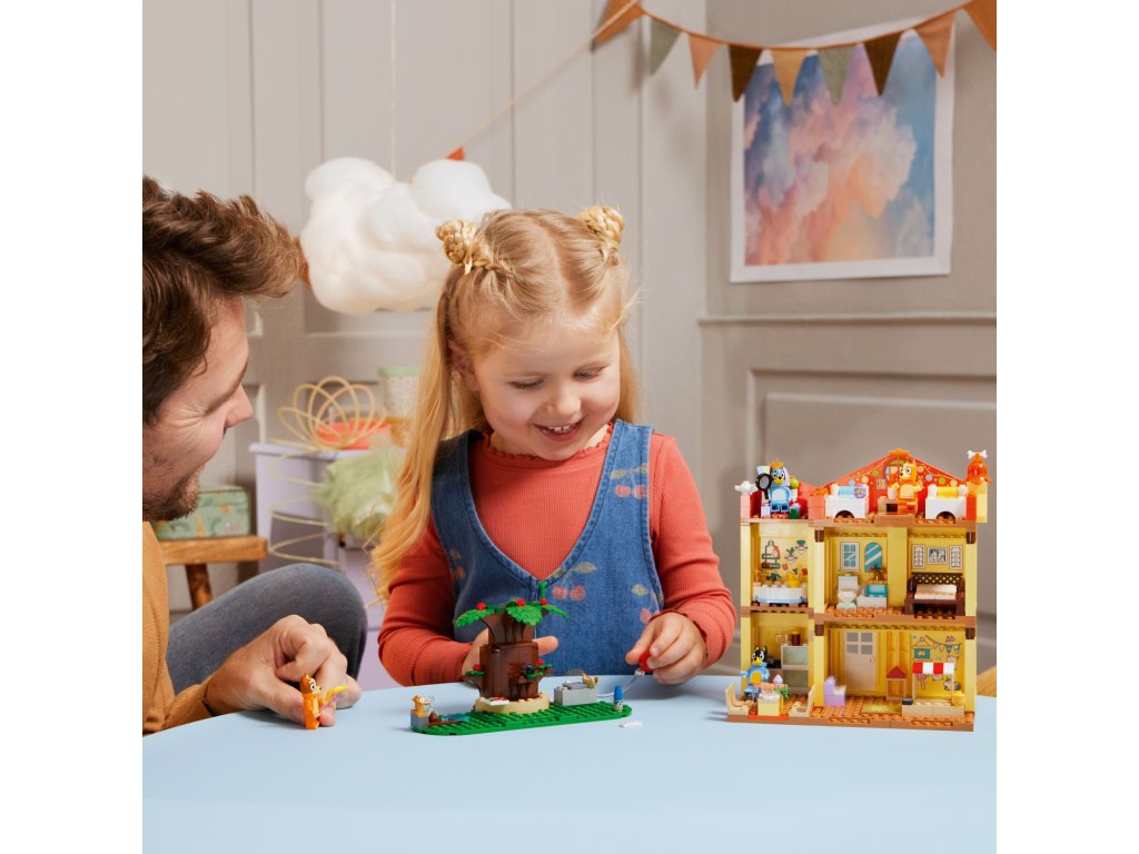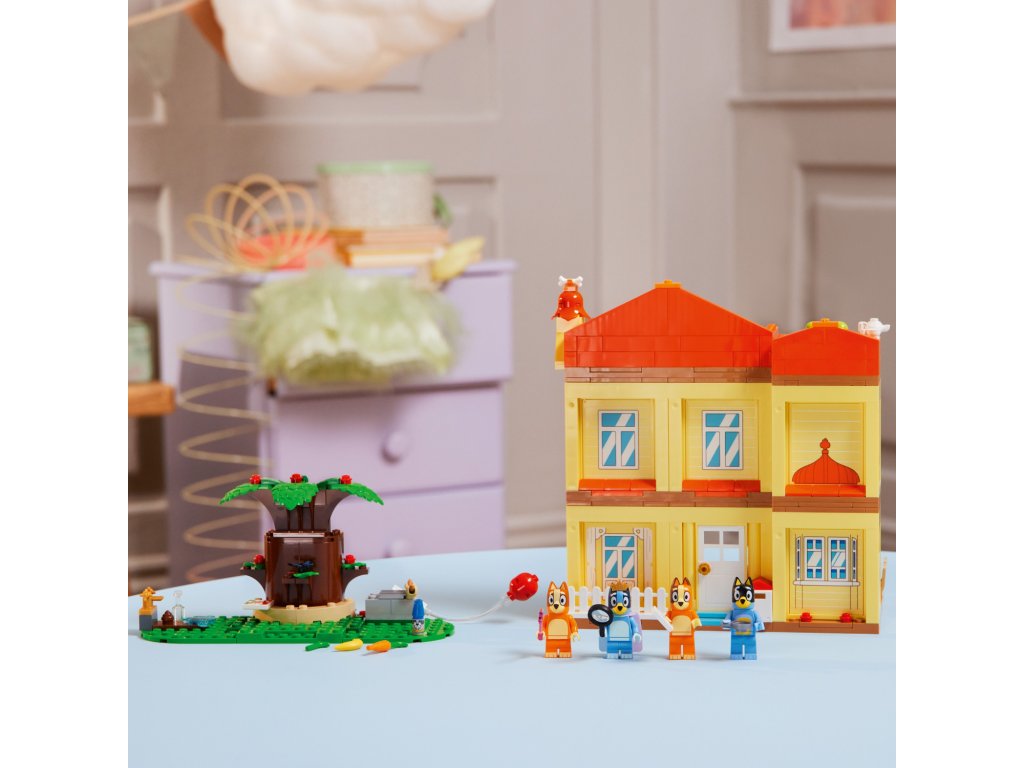 Modulární domeček s několika místnostmi obsahuje 4 minifigurky – Bluey, Bingo, Chilli (Blueinu maminku) a Bandita (Blueina tatínka) – a řadu doplňků včetně duhového pláště, hůlky a lupy. Děti můžou všechny místnosti odpojit a užít si tak spoustu způsobů hraní. Uvnitř herny najdete domeček pro panenky, klavír a stánek s jídlem. V kuchyni je lednice, trouba, sporák, stůl a židle. V horním patře se nachází ložnice mámy a táty a koupelna. V podkrovním pokojíčku Bluey a Bingo je koberec, lampa a figurka Kecala. Ve vedlejším pokoji najdete královnin trůn s čajovou konvicí, šálkem a žábou. Na zahradě je velký strom, párek v rohlíku, pizza, vodovodní kohoutek, trpaslík Jeremy a balón, který postavičky můžou házet do vzduchu.
