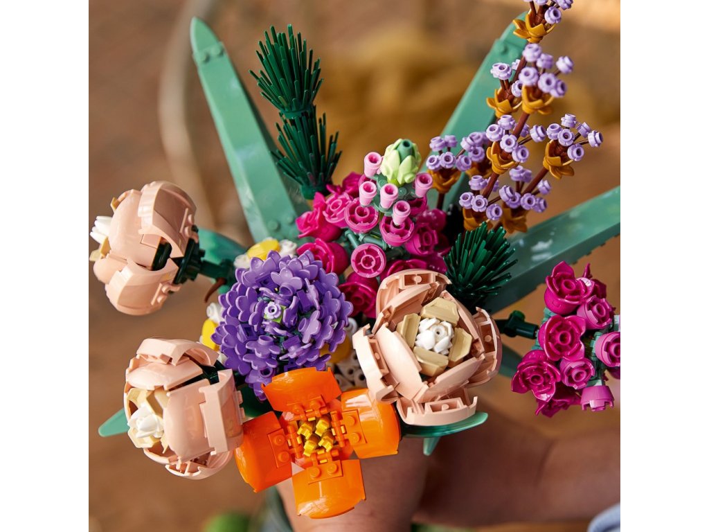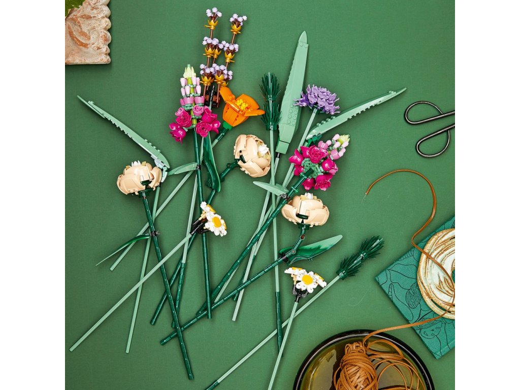 Všechny detaily kytice jsou vyrobeny z LEGO® součástek a lze je přizpůsobit tak, aby zanechaly jedinečný dojem. Většina květin má okvětní lístky, které lze přeuspořádat, takže si můžete užít zábavu při vymýšlení různých designů. Rozeberte stonky a znovu je složte jiným způsobem, čímž změníte výšku a tvar vašich květin. Sada je součástí botanické LEGO® kolekce pro dospělé a obsahuje několik dílků z rostlinného plastu, který se trvale udržitelným způsobem vyrábí z cukrové třtiny.