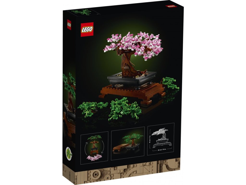 Umění pěstování bonsajů uchvacuje fantazii milovníků stromů po celá staletí. Nyní můžete toto starodávné umění oslavit pomocí LEGO® stavebnice s modelem bonsaje. Vychutnejte si pocit klidu, který zažijete při tvarování bonsaje pomocí zelených listů nebo růžových třešňových květů. Když zatoužíte po změně, jednoduše vyměňte barevné koruny a dosáhněte zcela nového vzhledu. Prohlédněte si růžové květy pořádně zblízka – vidíte malé žabky, které tvoří jednotlivé květy?