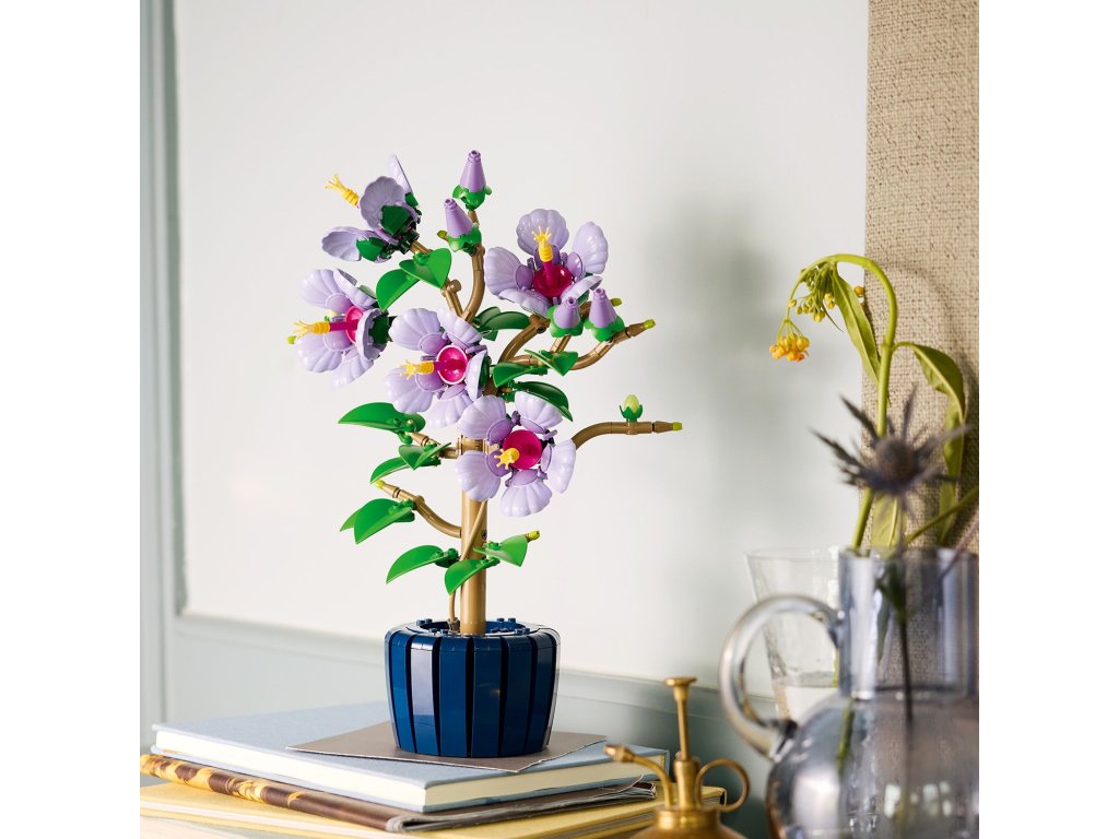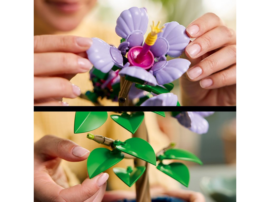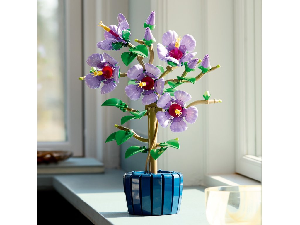 Vychutnejte si stavění propracované rostliny z kostek LEGO, která obsahuje 5 velkých květů, 4 květy v rozkvětu a 2 malá poupata. Velké květy zachycují jemnou krásu přírody a mají levandulově zbarvené okvětní lístky a žluté tyčinky a listy jsou světle zelené. Až budete mít model ibišku hotový, přesuňte okvětní lístky a nasměrujte listy do jedinečných aranžmá.