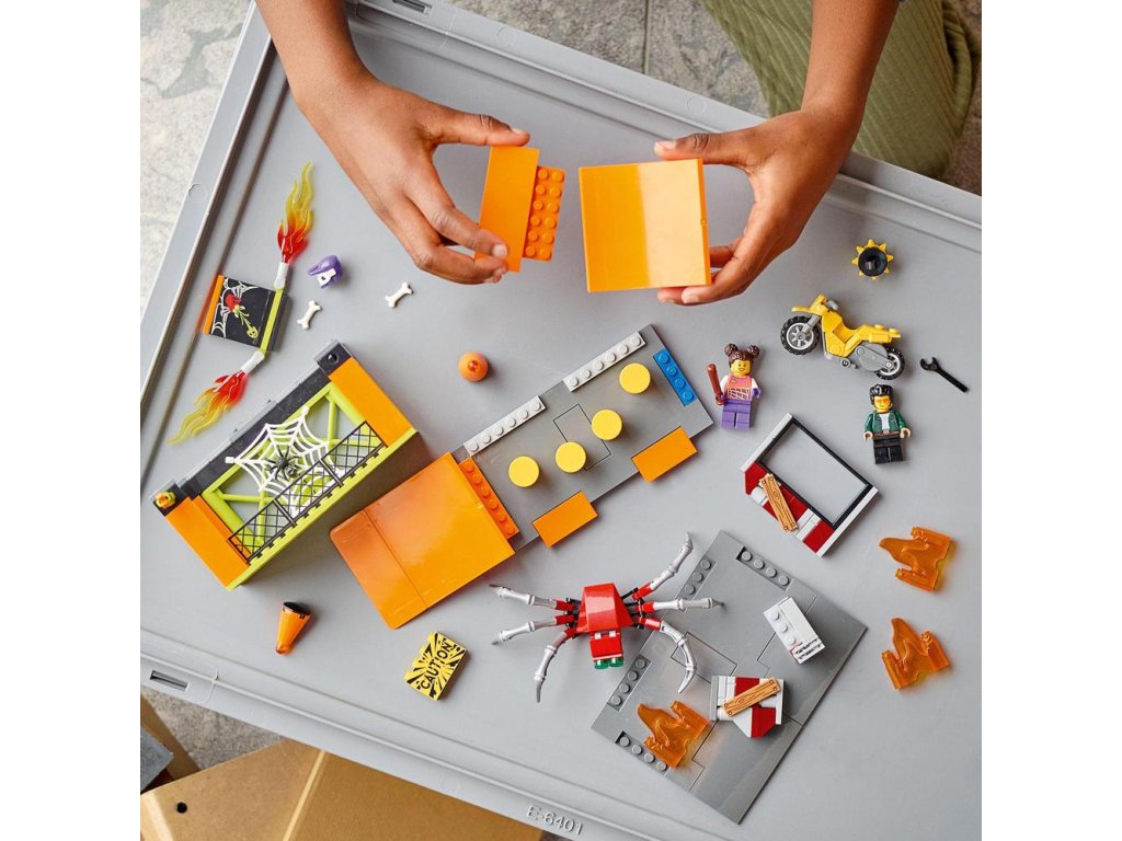 - Co děti najdou v krabici? Veškeré dílky potřebné k sestavení motorky se setrvačníkem a modulárního kaskadérského parku se 2 rampami, překážkami, ohněm a klecí s pavoukem. Také nechybí minifigurka Treada Octanea ze seriálu LEGO® City.