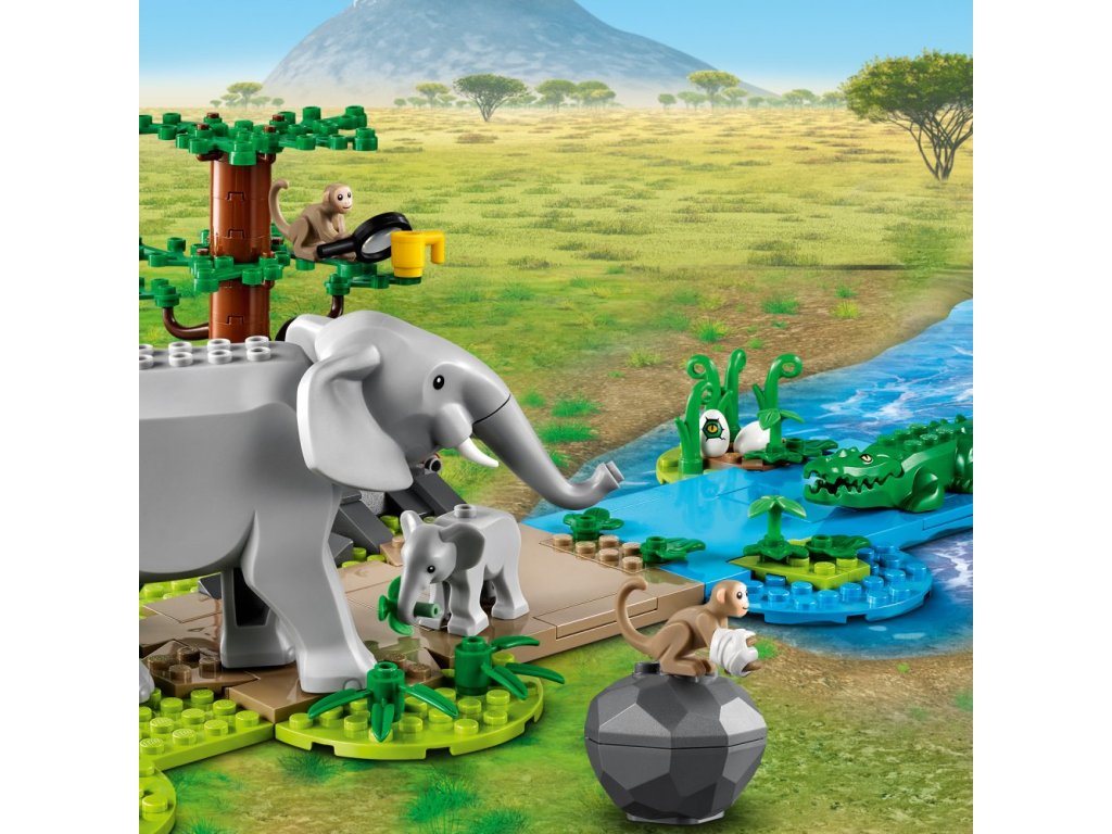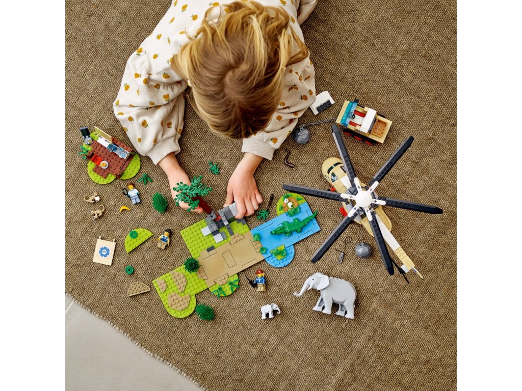 - Obsahuje vše, co děti potřebují pro sestavení vrtulníku s navijákem, pásového vozidla, veterinární stanice, prostředí savany s funkcí sesuvu půdy, ale také figurky slona, mláděte a hada, 2 figurky opic a 4 minifigurky.