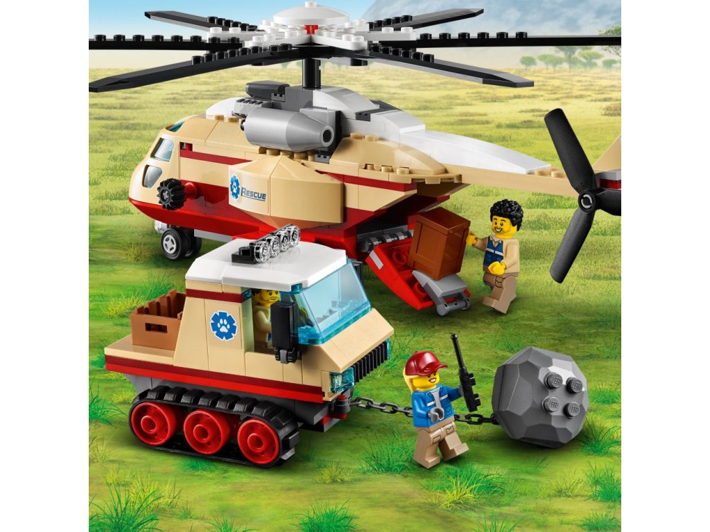Stavebnice Záchranná operace v divočině (60302) od LEGO® City obsahuje několik modelů a je nabitá funkcemi, včetně parádního vrtulníku s navijákem, pásového vozidla, prostředí savany s funkcí sesuvu půdy a veterinární stanice. Když se k tomu přidají figurky slonů, krokodýlů, opic a členů záchranářského týmu, stane se sada zdrojem strhující zábavy na dlouhé hodiny.
