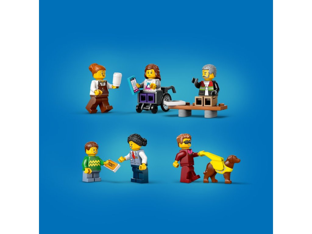 - Co najdete v krabici? – Tato stavebnice od LEGO® City obsahuje vše, co děti potřebují k sestavení tramvaje a zastávky s nástupištěm pro cestující a kavárnou, a navíc 6 minifigurek a figurku vodicího psa