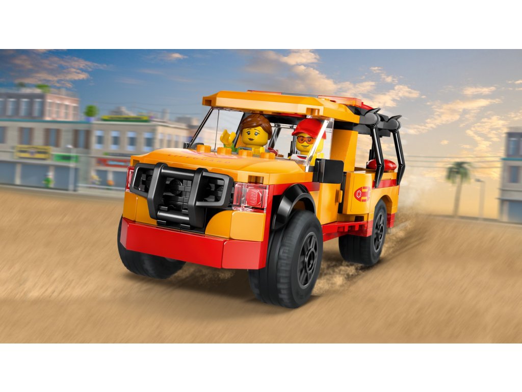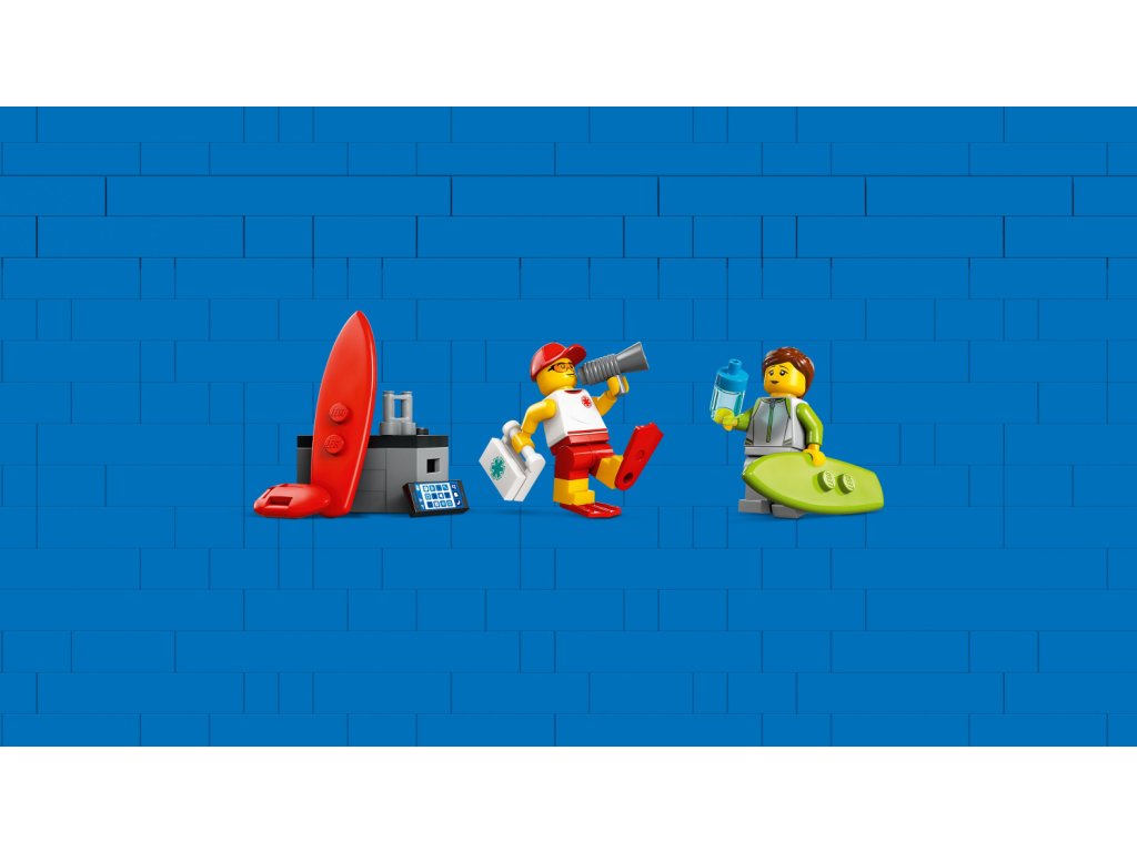 - Vozidlo LEGO® se zábavnými doplňky – Tato stavebnice pro děti obsahuje řadu doplňků, včetně 3 surfovacích prken, 2 záchranných bójí, ploutví, dalekohledu, megafonu, lahve s vodou,telefonu a lékárničky