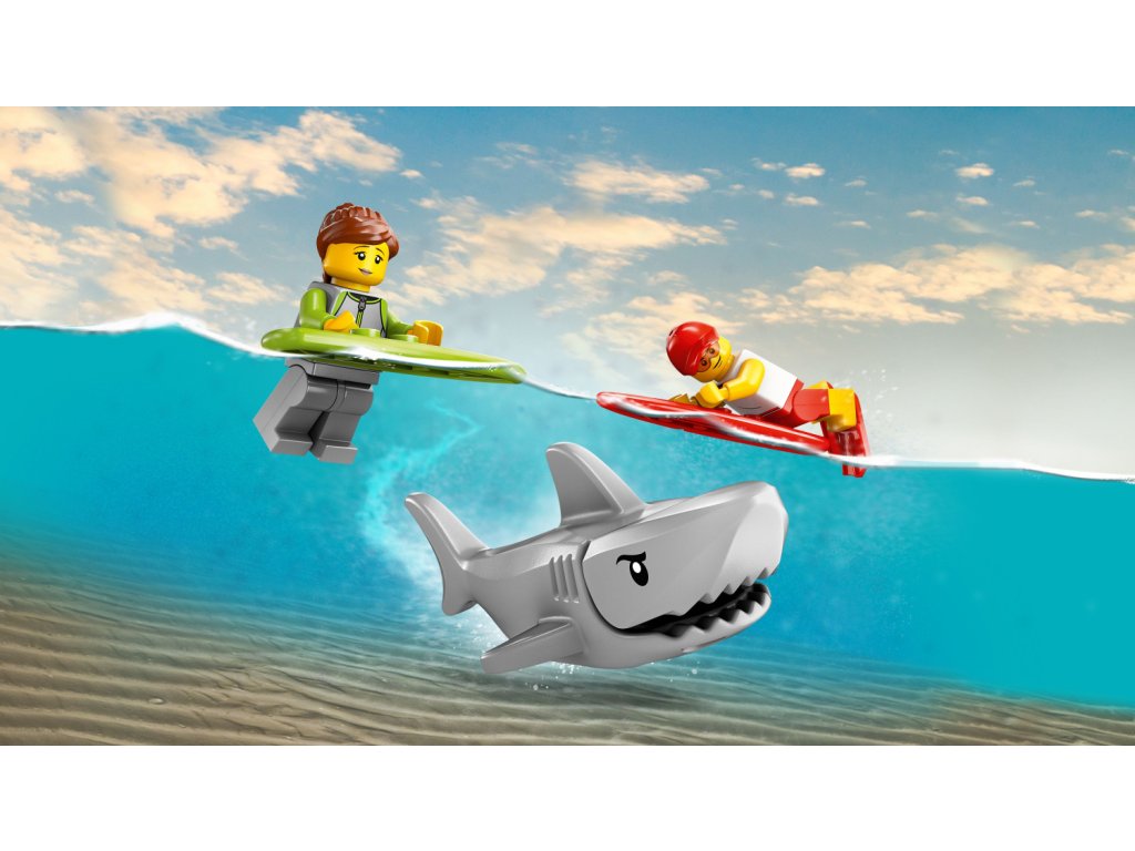 - Co najdete v krabici? – Tato stavebnice s plavčíkem obsahuje vše, co děti potřebují k sestavení terénního auta, minifigurku plavčíka a surfaře a figurku žraloka pro kreativní hraní