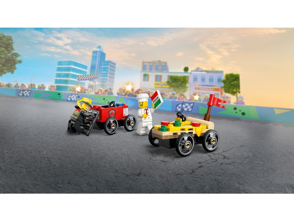 Darujte svému malému milovníkovi závodů od 5 let stavebnici LEGO® City (60458) Závodní balíček: Rozvoz pizzy vs. hasičské auto. Tato zábavná závodní stavebnice obsahuje 2 závodní minikáry a 2 minifigurky. Děti proti sobě postaví šéfkuchaře v minikáře v podobě horkého klínku pizzy a hasiče v minikáře v podobě červeného hasičského auta. Kdo vyhraje? Sedněte za volant a vydejte se na akční městské závody!