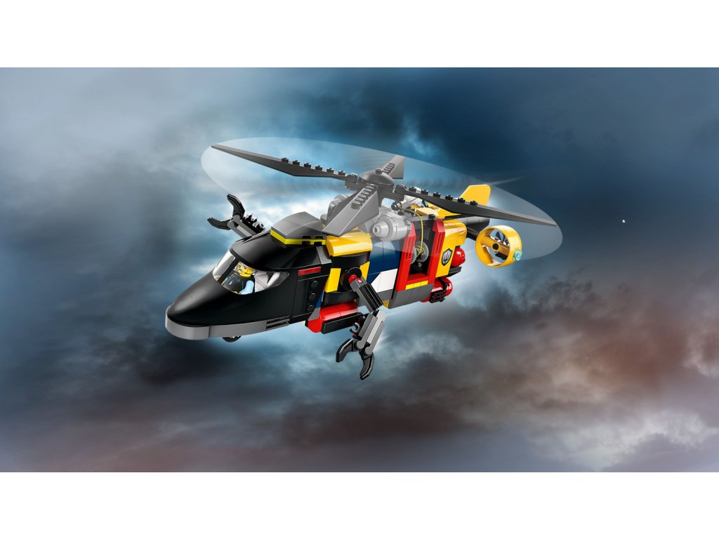 - Zábavné funkce pro realistické hraní – Součástí je ponorka s polohovatelnými rameny s drapáky, policejní helikoptéra s otáčejícím se hlavním rotorem a ocasními rotory a hasičské auto s výsuvnouhadicí
