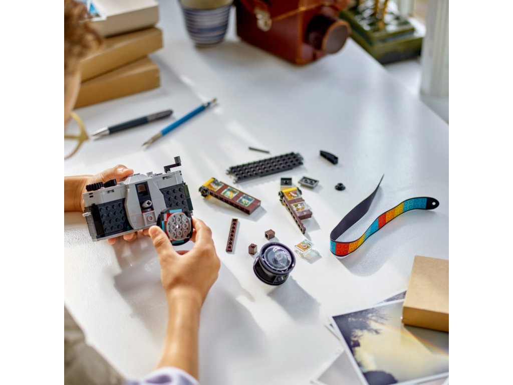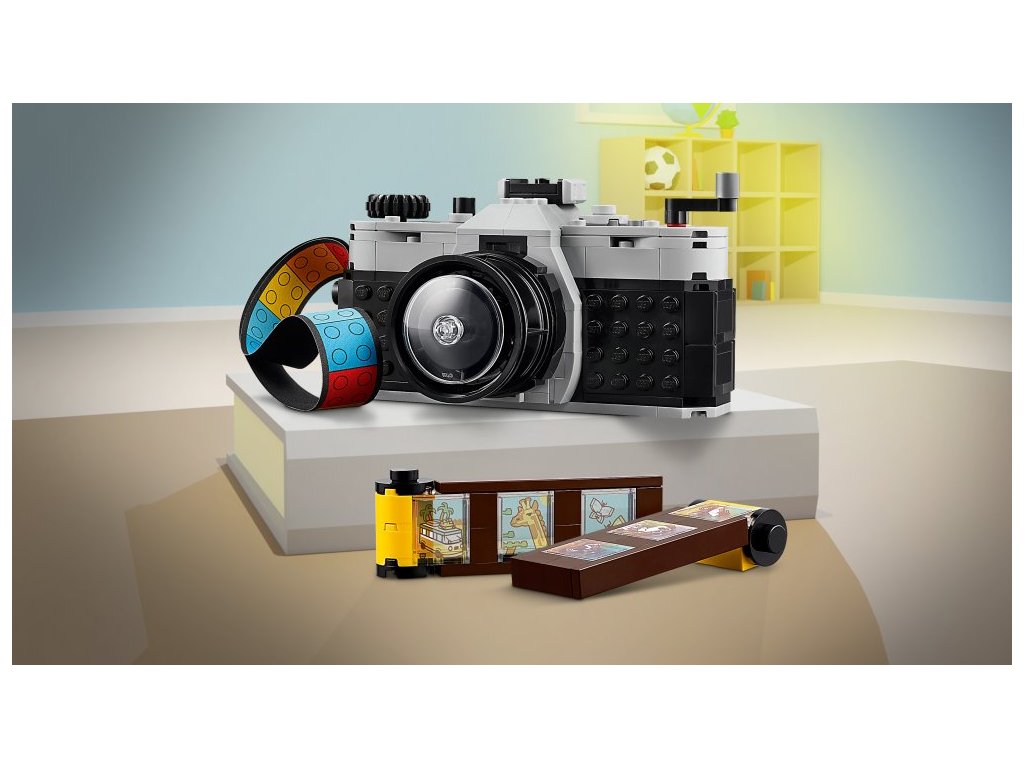 Inspirujte děti od 8 let k nápaditému hraní se stavebnicí LEGO® Creator 3 v 1 (31147) Retro fotoaparát. Model fotoaparátu má pohyblivý objektiv, na horní straně najdete tlačítka k pořízení fotografie a vzadu je otvor, do kterého můžete umístit film z kostek a barevný textilní pásek na nošení. Součástí je také 6 samolepek, které představují fotografie a děti je nalepí na jednotlivá filmová políčka.