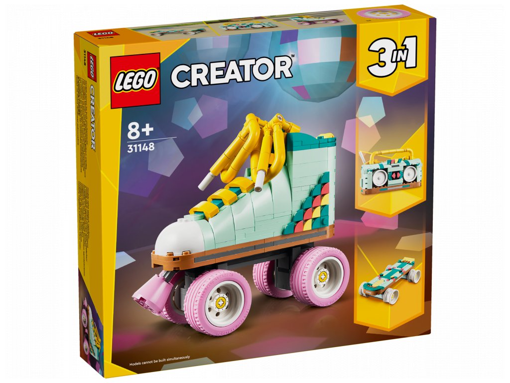 Kreativní děti od 8 let se se stavebnicí LEGO® Creator 3 v 1 (31148) Retro kolečkové brusle vrátí do minulosti. Postaví si s ní kolečkovou brusli LEGO se 4 pohyblivými růžovými kolečky, růžovou brzdou, tlustou žlutou tkaničkou a sadou barevných dílků, se kterými ozdobí patu brusle podle vlastní fantazie.