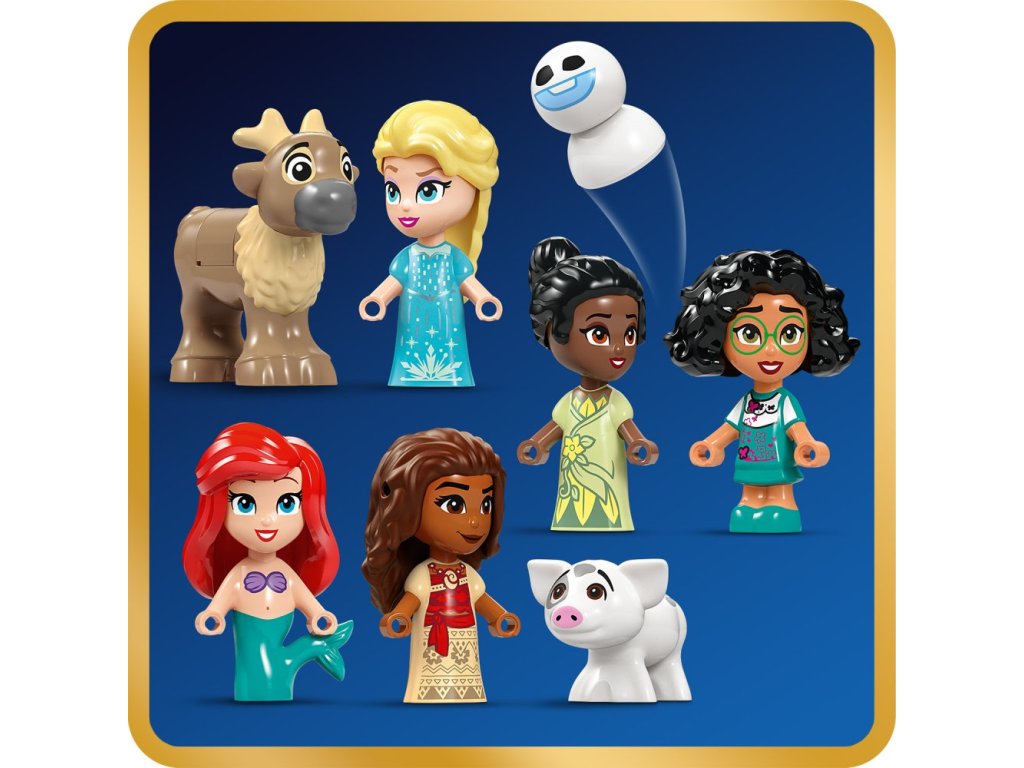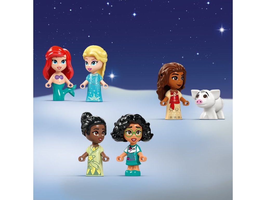- 8 postaviček a zábavné doplňky – Součástí tohoto Adventního kalendáře jsou mikropanenky LEGO® ? Disney Elsa, Tiana, Ariel, Mirabel a Vaiana, a navíc postavička Pua, sněhuláčka a Svena, dárky a spousta dalšího