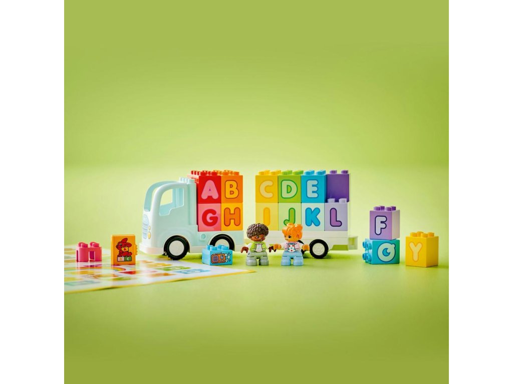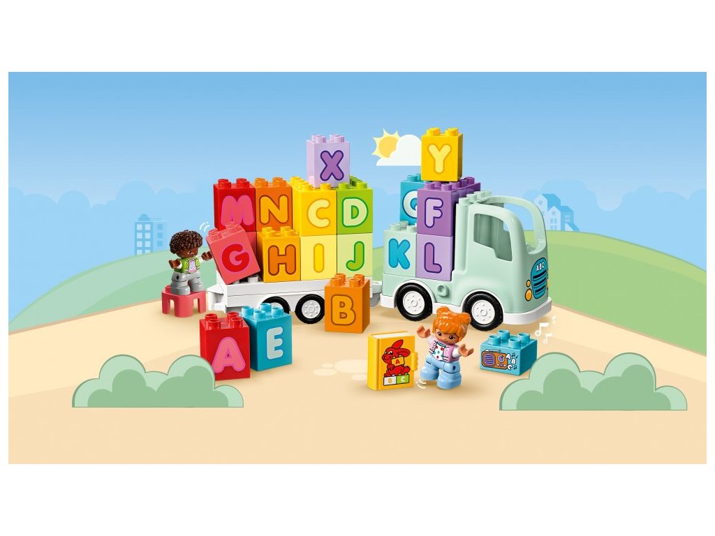 Tato kreativní hračka s abecedou přináší spoustu možností učení hrou. Malé děti si vyzkouší připojení přívěsu k náklaďáku, pomohou 2 figurkám LEGO DUPLO naskládat a vyskládat kostky a naučí se rozpoznávat písmena, barvy, zdokonalí mluvení a procvičí si jemné motorické schopnosti.