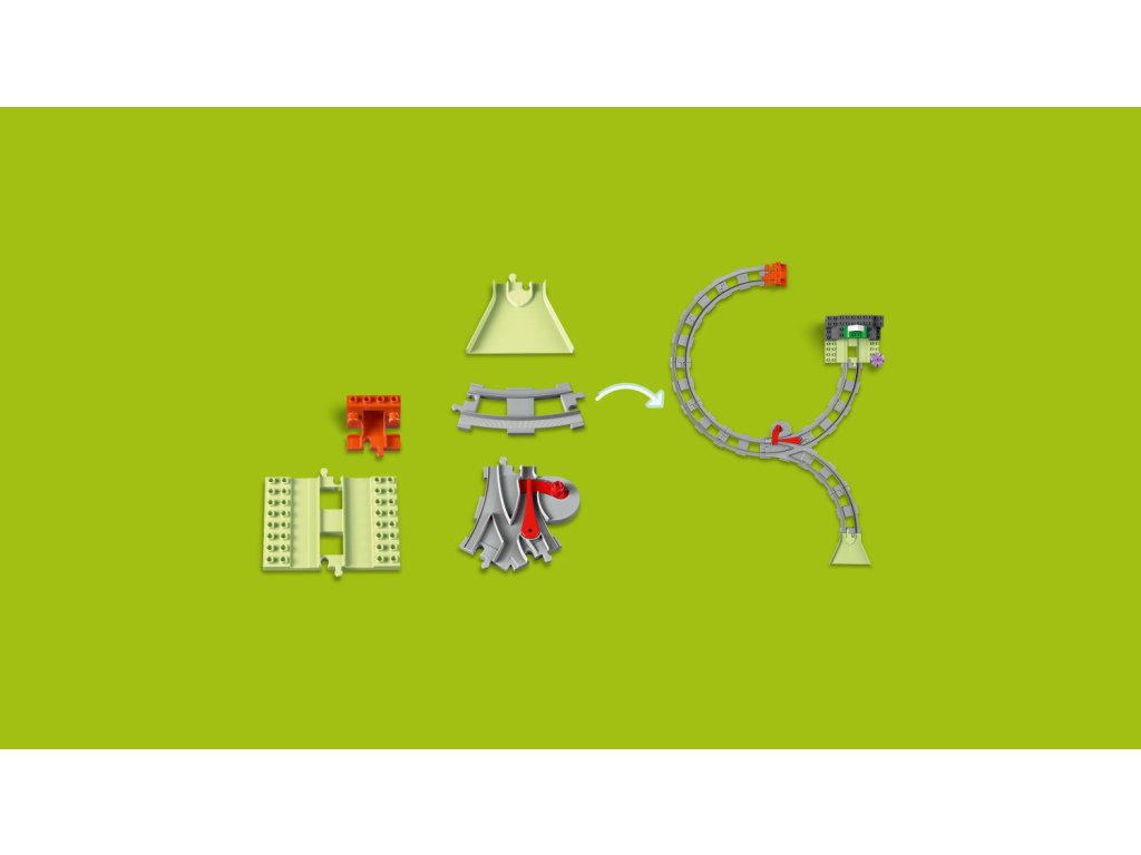 Součástí této kreativní stavebnice je model tunelu, 10 dílků kolejnice, komín a dvojitá výhybka, pomocí které děti mohou změnit směr jízdy vláčku. Akční kostka rozsvítí tmavý tunel, kdyžji aktivuje interaktivní vláček ze stavebnic 10427 a 10428.