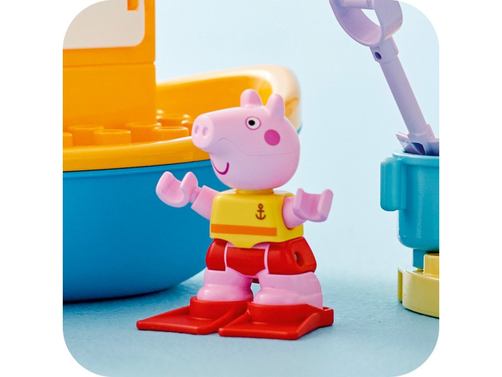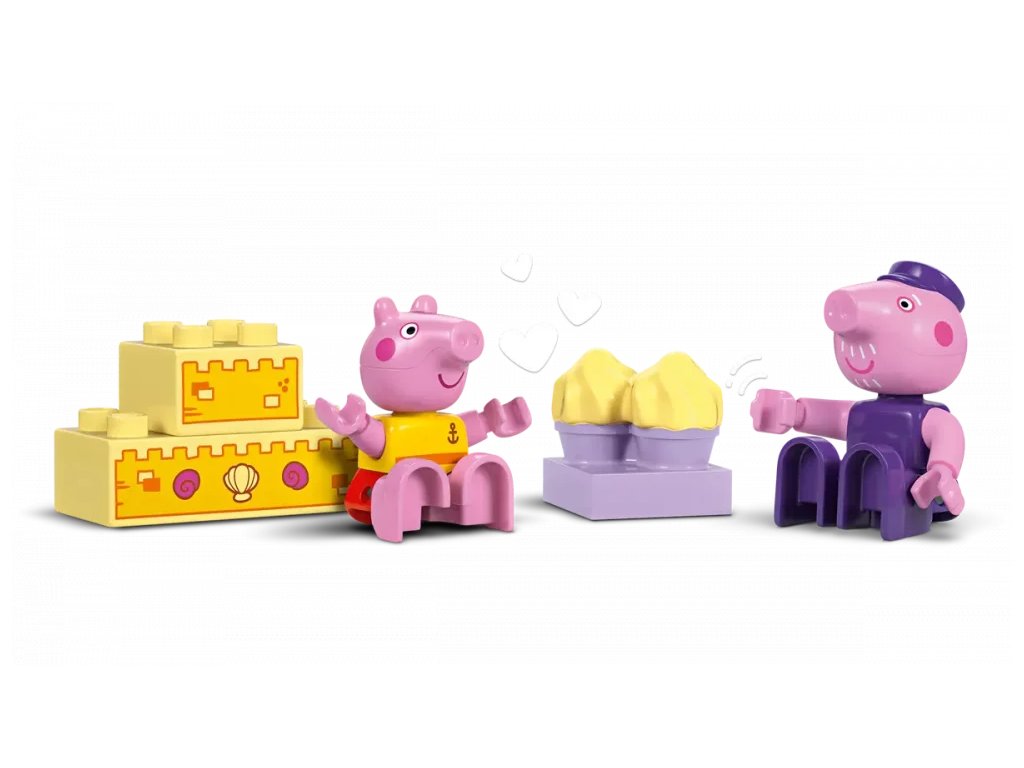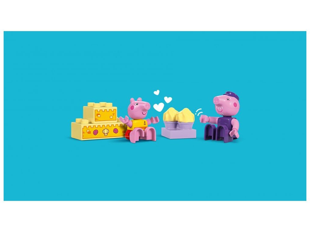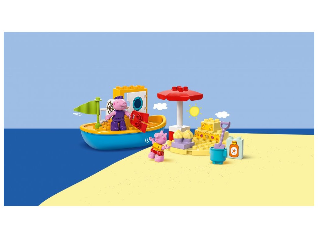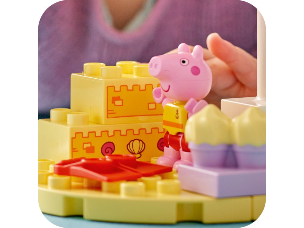 Tato zábavná stavebnice je plná inspirativních kreativních doplňků, se kterými se děti snadno pustí do vymýšlení příběhů. Pomůžou Peppě namazat se opalovacím krémem, vydají se hledat mušle a procvičí svou zručnost při stavění hradu z písku. Když bude sluníčko příliš pálit, Peppa se schová pod slunečník nebo si zaplave a děti procvičí svou koordinaci rukou a očí a jemné motorické schopnosti při nasazování ploutví. Děti se mohou zchladit, když budou chtít – model loďky z této stavebnice s prasátkem Peppou skutečně plave, takže si s ní užijí zábavu i ve vodě.