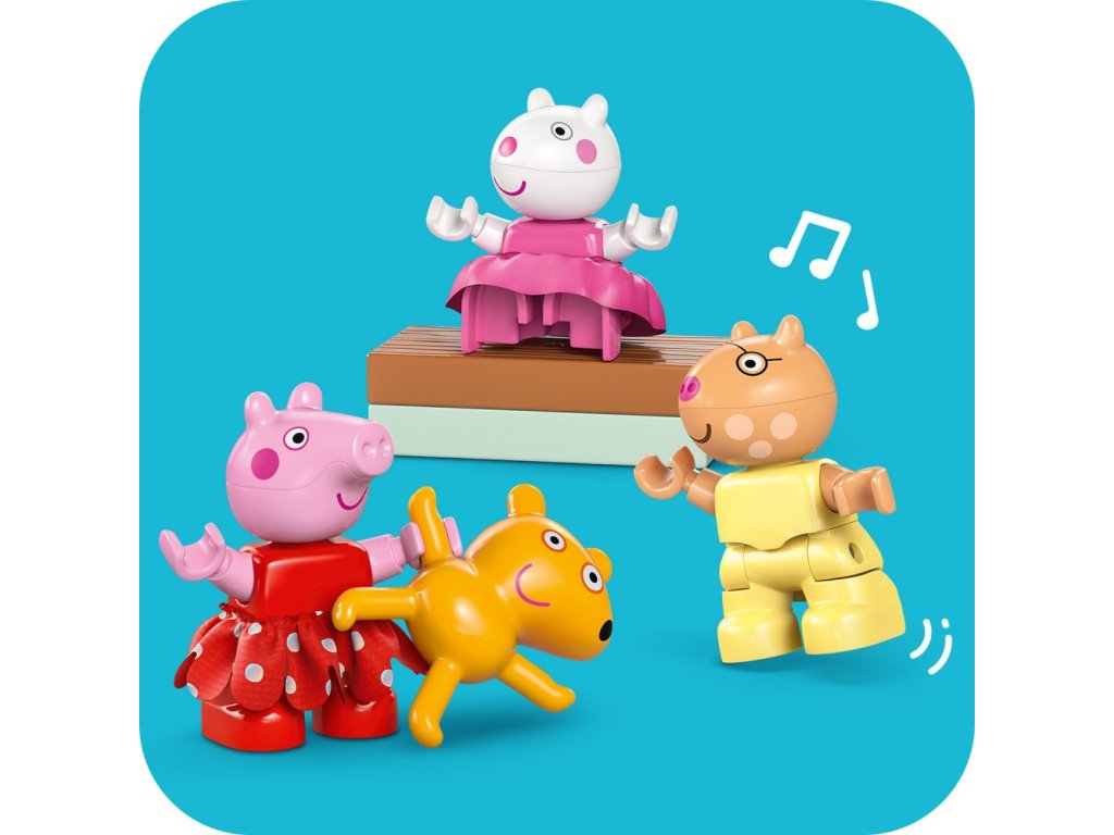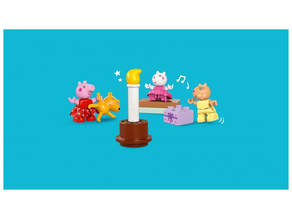 Stavebnice LEGO® DUPLO® Prasátko Peppa jsou navržené tak, aby podporovaly rozvoj celé řady dovedností malých dětí. Malí stavitelé prohlubují své logické myšlení při napodobování skutečného života a inscenování různých aktivit na oslavě, jako je vítání kamarádů, předávání dárečků a krájení dortu. Rozvíjejí také schopnost sebevyjádření, když si představují, že jsou součástí takové radostné oslavy.