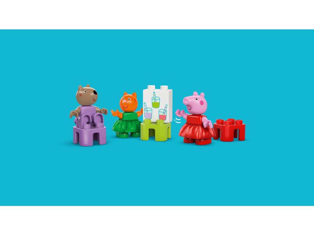- Stavebnice nabitá funkcemi – Tato stavebnice pro nejmenší obsahuje 3 figurky LEGO® DUPLO®: Prasátko Peppu, psa Danyho a kočku Máňu, a navíc otáčející se ruské kolo, skluzavku a džusový bar