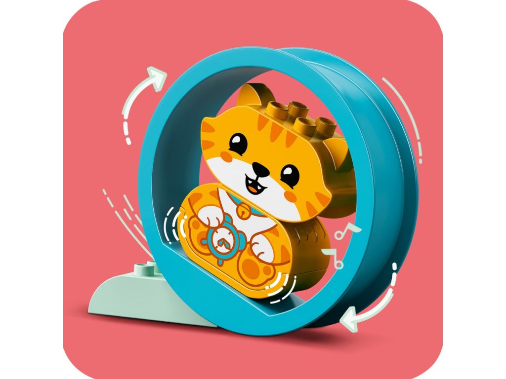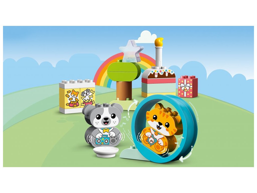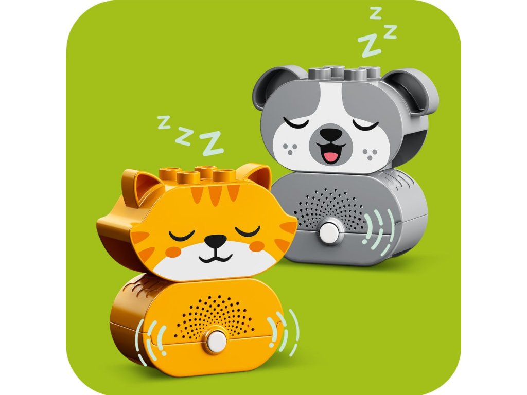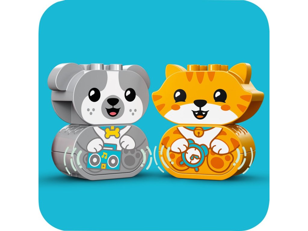 V této rozkošné stavebnici na vás čeká koťátko a pejsek. Obě figurky jsou tvořené 2 dílky vhodnými pro malé děti. Malí milovníci zvířat mohou své mazlíčky umístit do speciální kutálející se hračky. Zvukové funkce jednotlivých zvířat dále rozšiřují herní a výukové možnosti – zvuky totiž děti upozorní, když je čas na jídlo, hraní, spánek a tak dále. Jedná se o skvělý způsob, jak si předškoláci mohou osvojit každodenní rutiny.