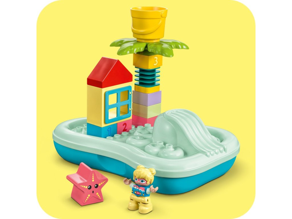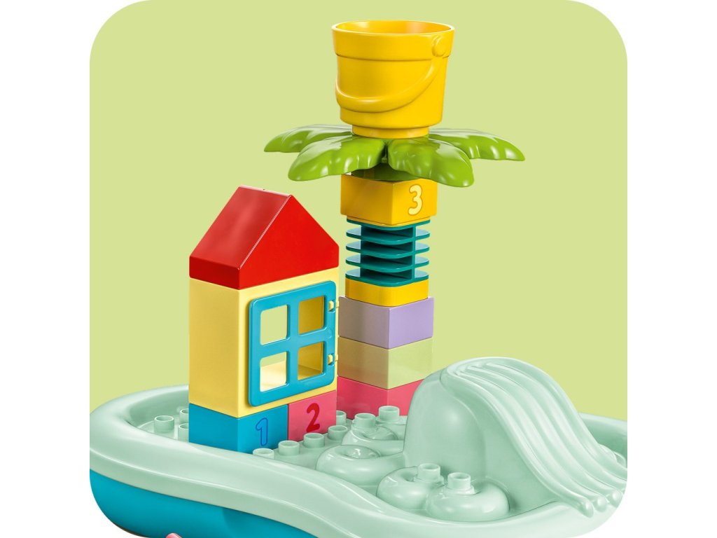 Tato vzdělávací hračka obsahuje ohýbací palmu, kterou mohou děti nechat růst pomocí kostek s čísly 1-2-3. Děti naplní kyblík na stromě vodou a pocákají figurku dítěte. Můžou figurku nechat sklouznout po vodní skluzavce a vylétnout až na nafukovací želvičku. Po naplnění mráčku vodou děti spustí déšť na všechny zábavné prvky.