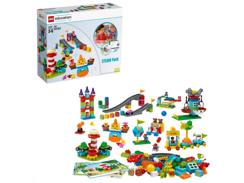 Sada LEGO® Education 45024 DUPLO® STEAM Park je unikátní sadou pro maximální rozvoj vašeho malého stavitele. Díky všemožným druhům kostek a funkcí se při budování a návštěvě parku plného atrakcí a zábavy, snadno porozumí principům pohybu, rovnováhy a převodů, zdokonalí si prostorovou orientaci, získají dovednosti pro odhad a jednoduchá měření, seznámí se s pravděpodobností, pravidly příčiny a následku, naučí se řešit problémy z reálného světa, sdílet myšlenky a prezentovat výsledky vlastní práce.