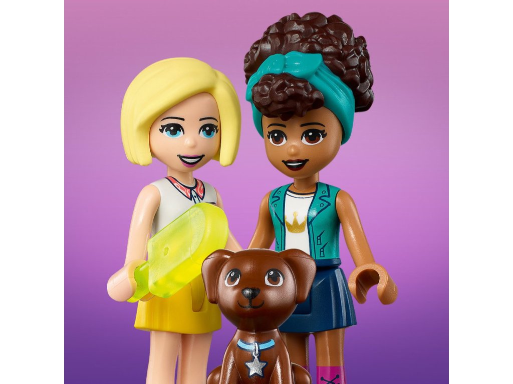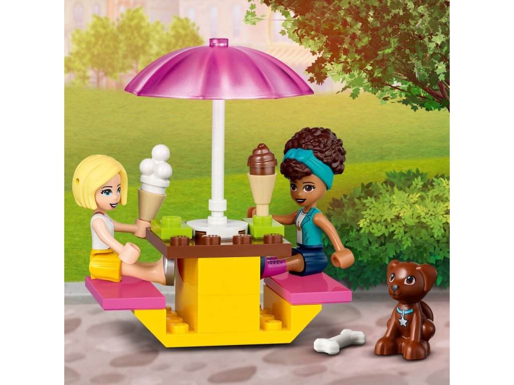 - Kreativní dárek plný detailů – obsahuje minipanenky postav LEGO® Friends Andrei a Roxy, figurku pejska, a kostky potřebné k sestavení barevného zmrzlinářského vozu