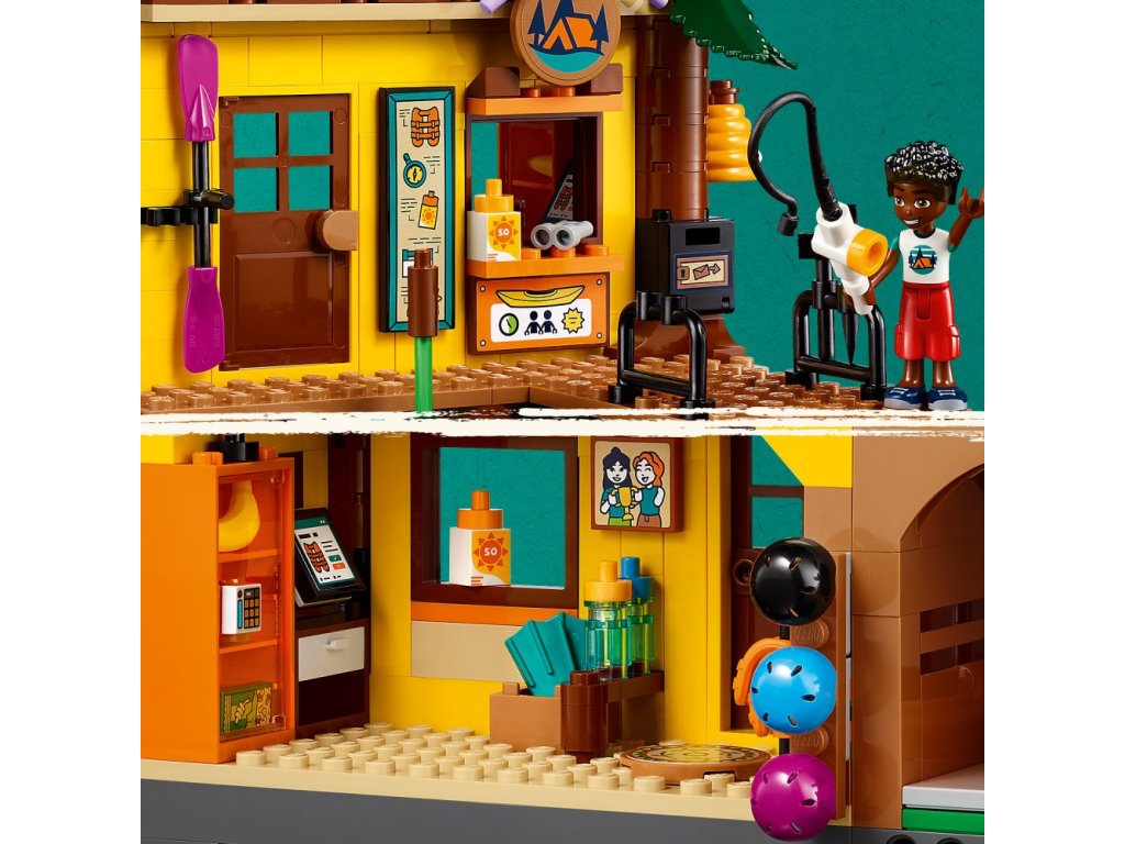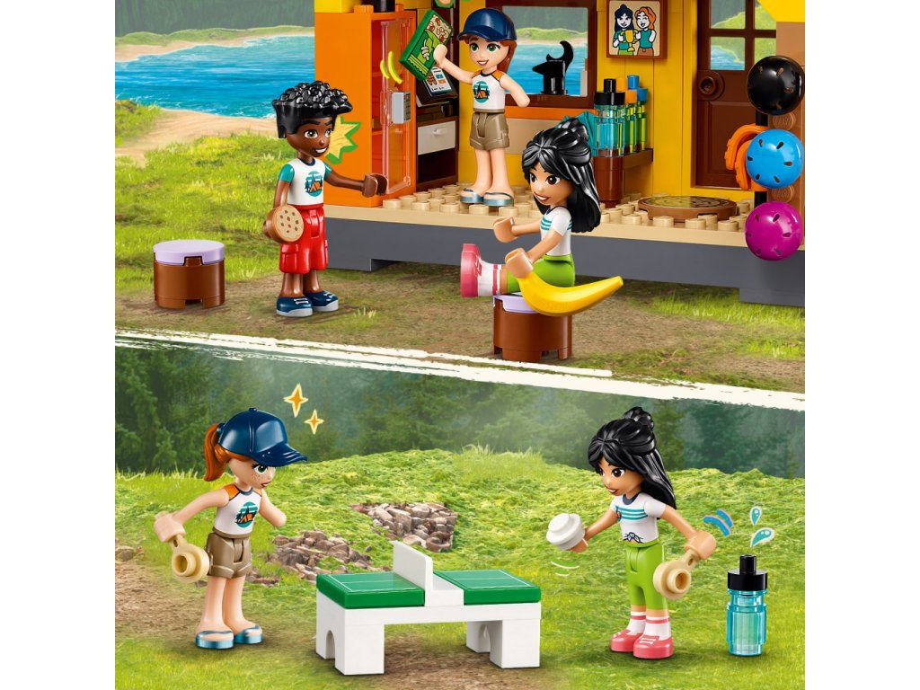 Součástí této stavebnice LEGO Friends je spousta doplňků na nekonečné vyprávění příběhů. Uvnitř dobrodružného tábora najdete vybavení, které si postavičky půjčí, sprchu, lékárničku, trofeje a spoustu dalšího. Po zábavném dni si kamarádi oddechnou v odpočinkové zóně nebo si zahrají stolní tenis.