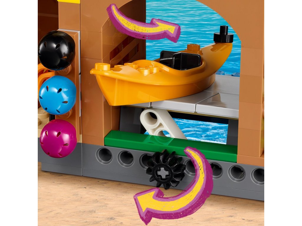 Děti se můžou pustitdo hraní příběhů. Nasadí postavičkám přilby, záchranné vesty, vloží jim do rukou pádla a otočením kolečka z mola spustí 2 kajaky. Nechybí funkce, která dětem umožňuje házet žabky z mola.