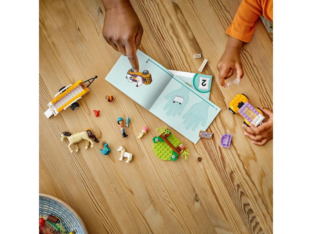 Stavebnice LEGO® Friends (42634) Přívěs s koněm a poníkem pro děti od 4 let nastartuje hodiny kreativního hraní. Děti, které milují příběhy, si postaví model auta a přívěsu a pustí se do vyprávění o dobrodružstvích kamarádek Liann a Zoyi.