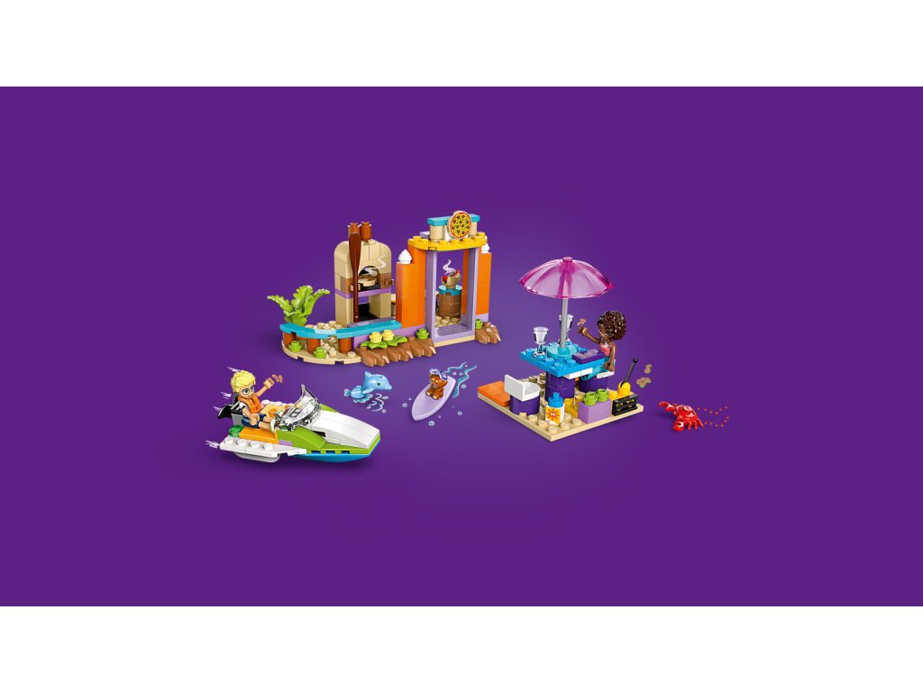 Tato stavebnice obsahuje vše, co děti potřebují k sestavení hydroplánu s otočnou vrtulí, odpočinkové zóny se surfovacím prknem a plážové kavárny s hrady z písku, posezením a zmrzlinou. Stavebnici lze přestavět na model motorového člunu, venkovní posezení a pizzerii s pecí na pizzu. Součástí stavebnice jsou 2 minipanenky a figurky psa a delfína, se kterými si užijete spoustu zábavného hraní.