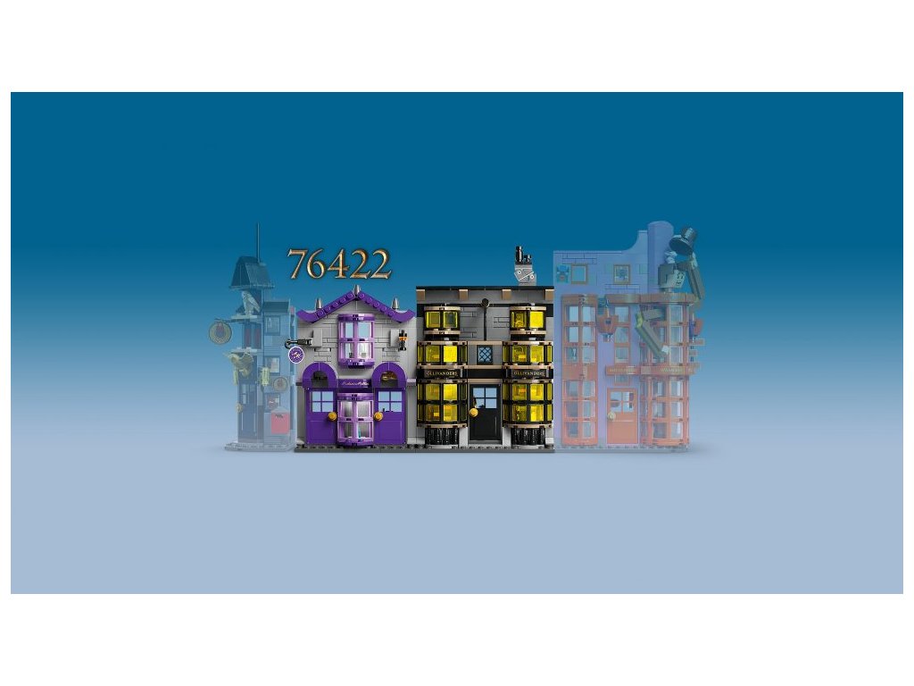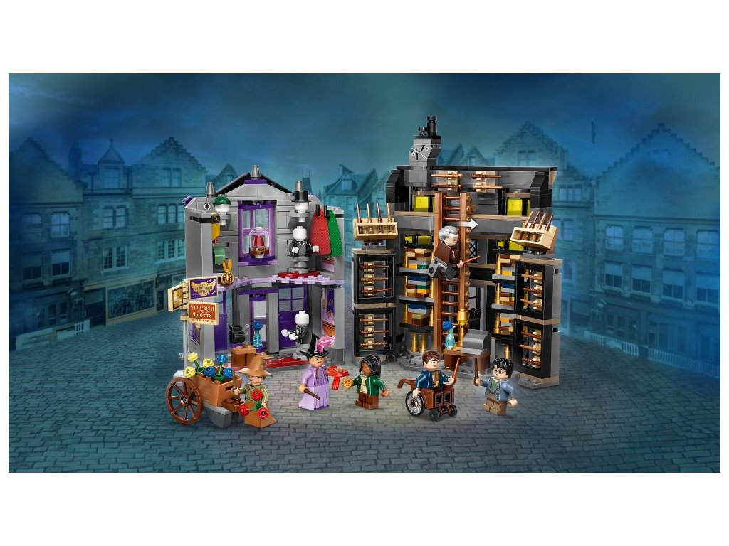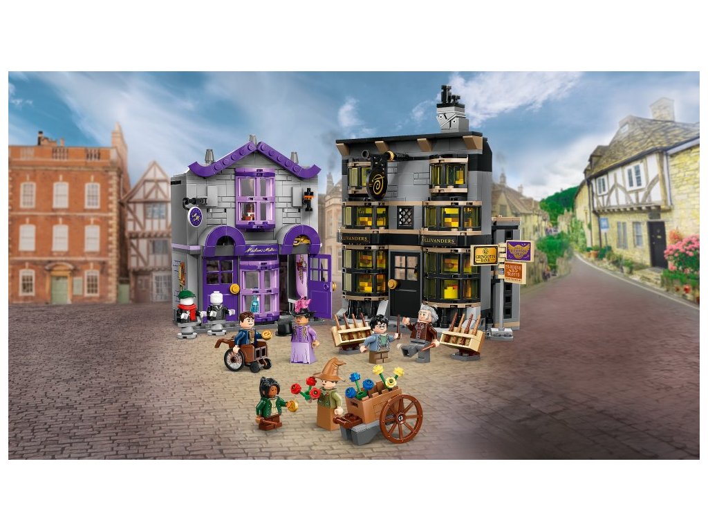 - 2 obchody z Příčné ulice – Tato stavebnice představuje zábavný dárek pro fanoušky Harryho Pottera a součástí je detailně zpracovaný model Ollivanderova obchodu a Obchodu madame Malkinové pro kouzelné hraní