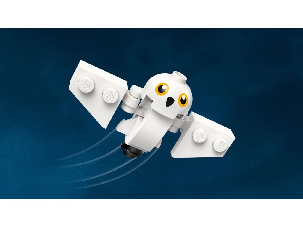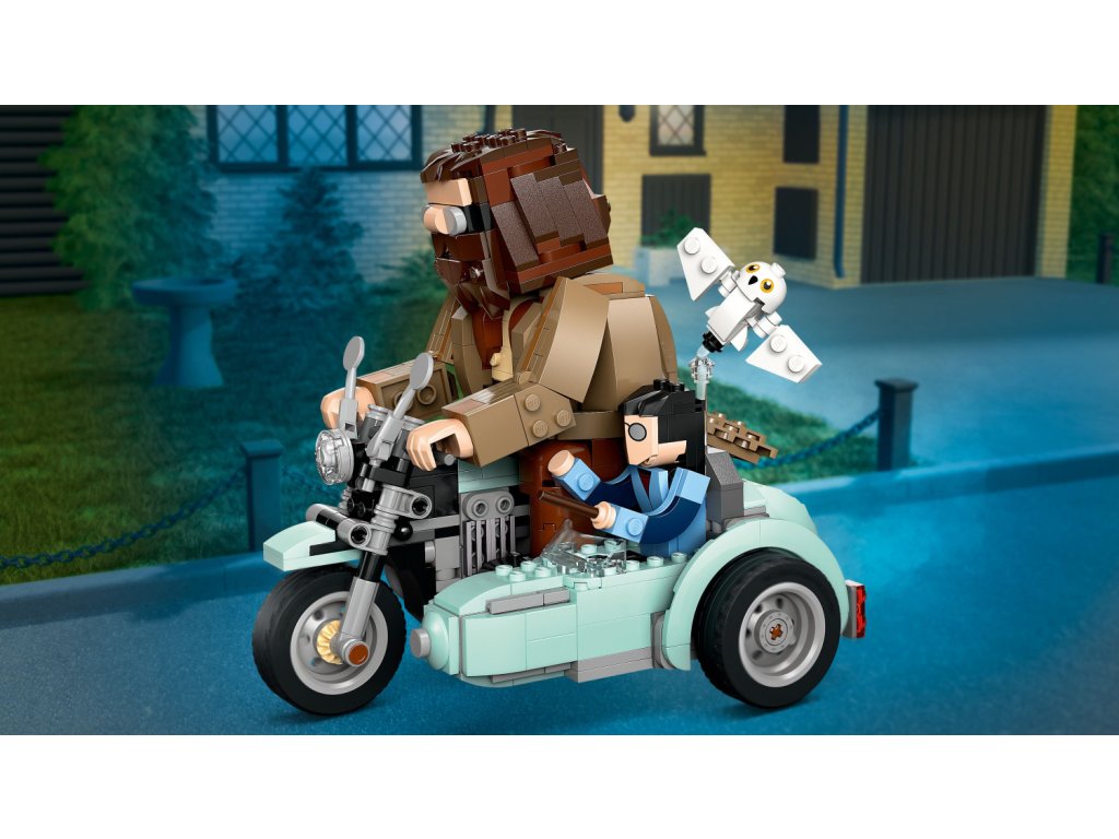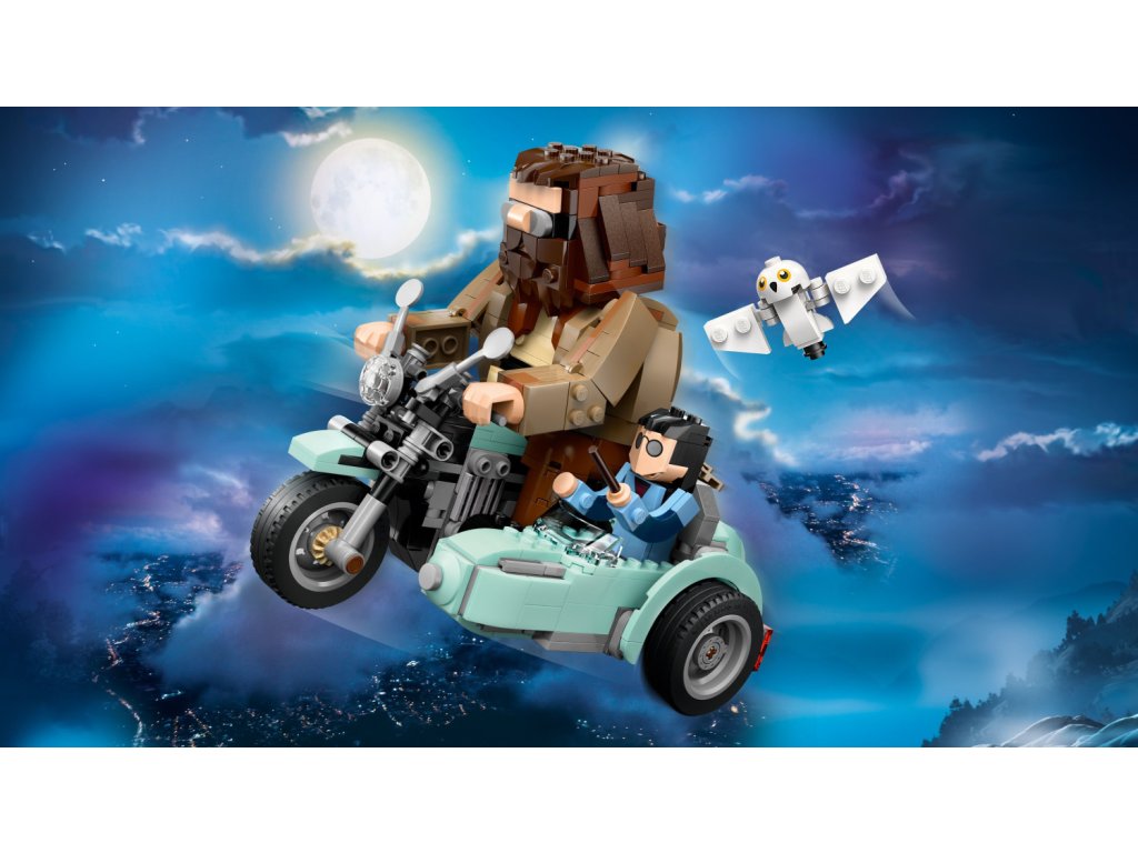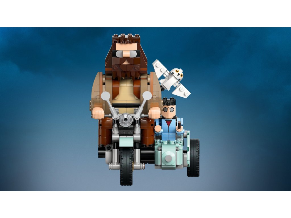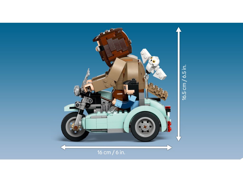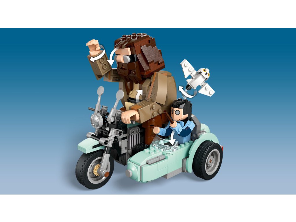 - 3 postavy LEGO® Harry Potter™ z kostek – Model obsahuje vestavěné pohyblivé figurky Harryho Pottera, Hedviky a Rubeuse Hagrida, kteří jedou na Hagridově létající motorce se sajdkárou