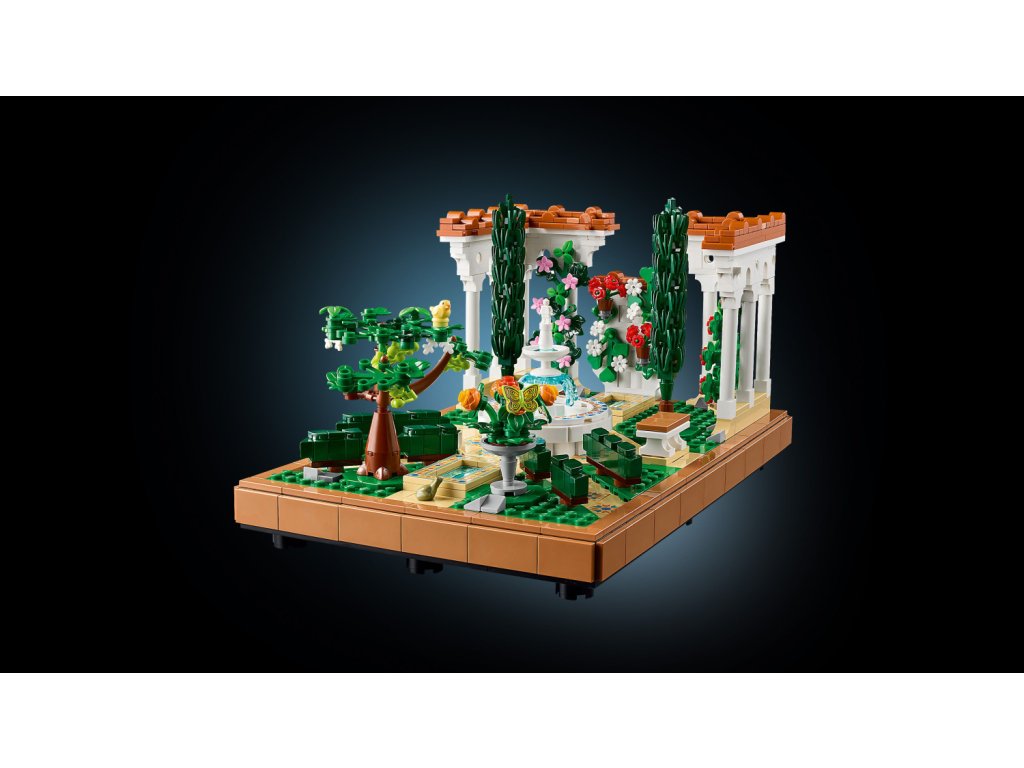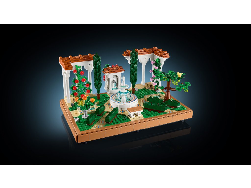 - Co najdete v krabici – LEGO® Zahrada s fontánou obsahuje stupňovitou fontánu, lavabo, 2 cypřiše, kvetoucí vinnou révu, 4 pergoly a dlážděné cestičky a figurku můry, ptáka a žáby