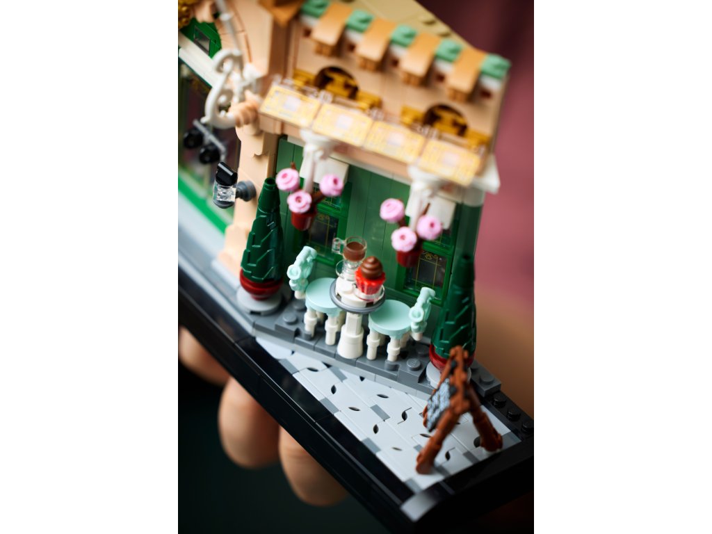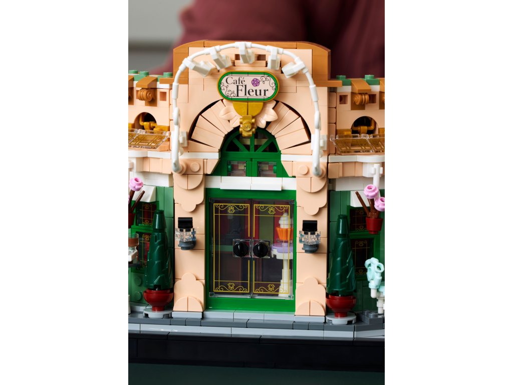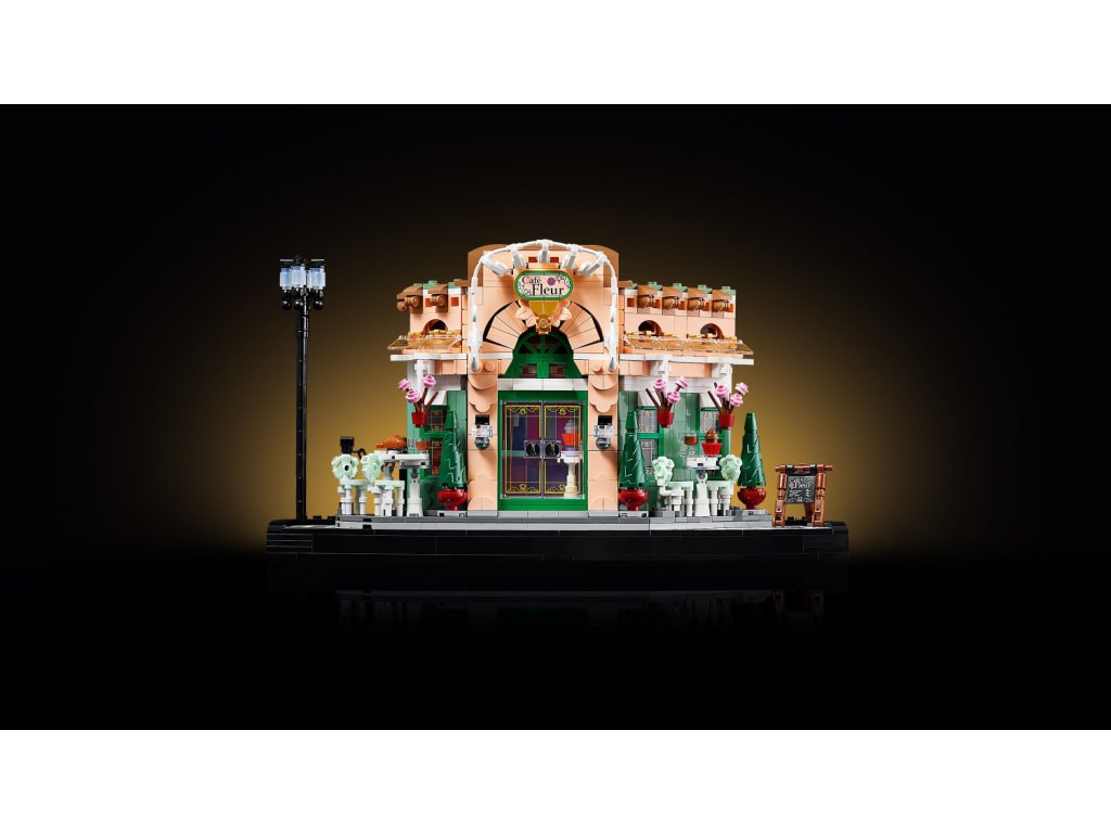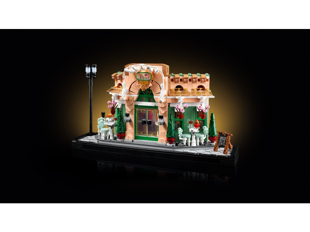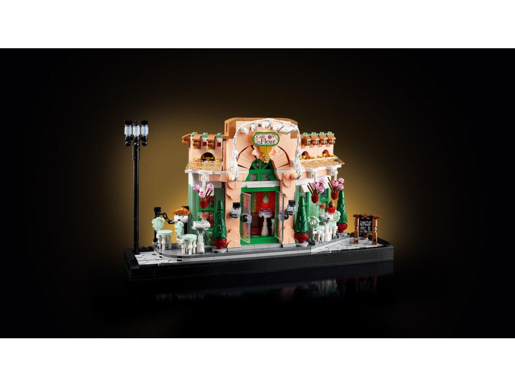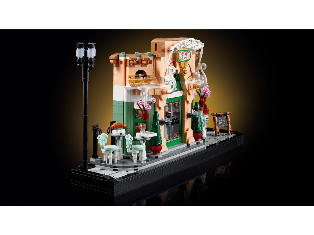 Chodník z kostek s klasickým pouličním osvětlením dokonale dokresluje atmosféru kavárny Café Fleur s malebnou fasádou, zdobeným posezením, zavěšenými květináči a dvojitými dveřmi, které lze otevřít a odhalit útulný interiér s královskými tapetami a nábytkem z tmavého dřeva. Model je plný propracovaných detailů a doplňků, jako jsou croissanty, šálky, noviny a pokladna, a zachycuje kouzlo klasického francouzského bistra. Model je díky ploché zadní straně úzký a ideální na vystavení na polici.