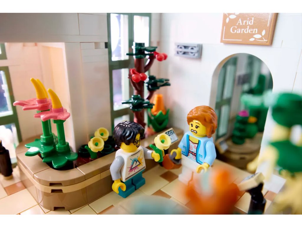 Oživte tento výstavní model pro dospělé 12 minifigurkami LEGO, včetně 4 členů personálu a řady návštěvníků, a navíc různými figurkami zvířat a doplňky, jako jsou sluchátka pro prohlídky s průvodcem a pomůcky pro zahradničení.