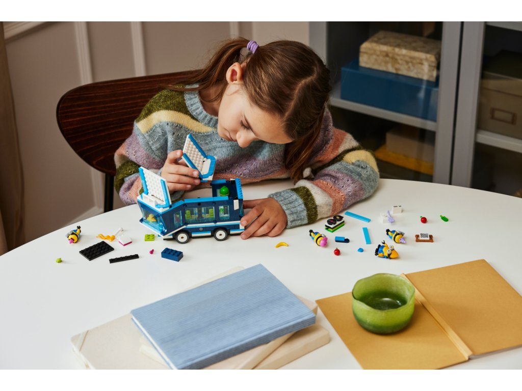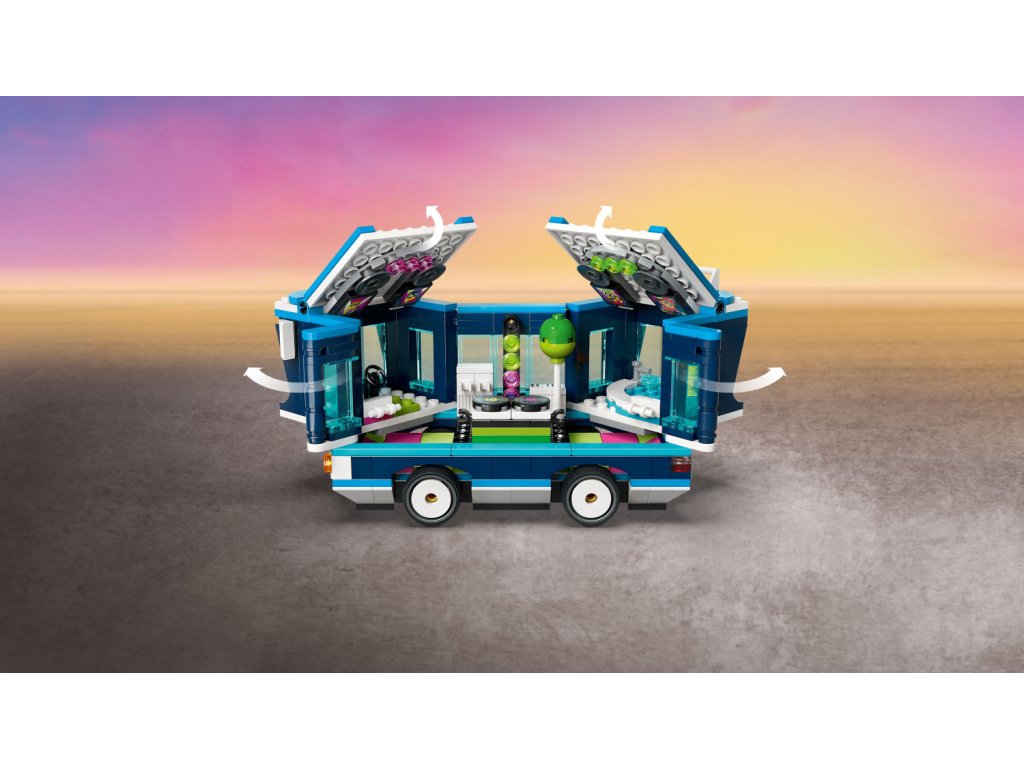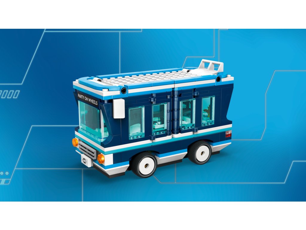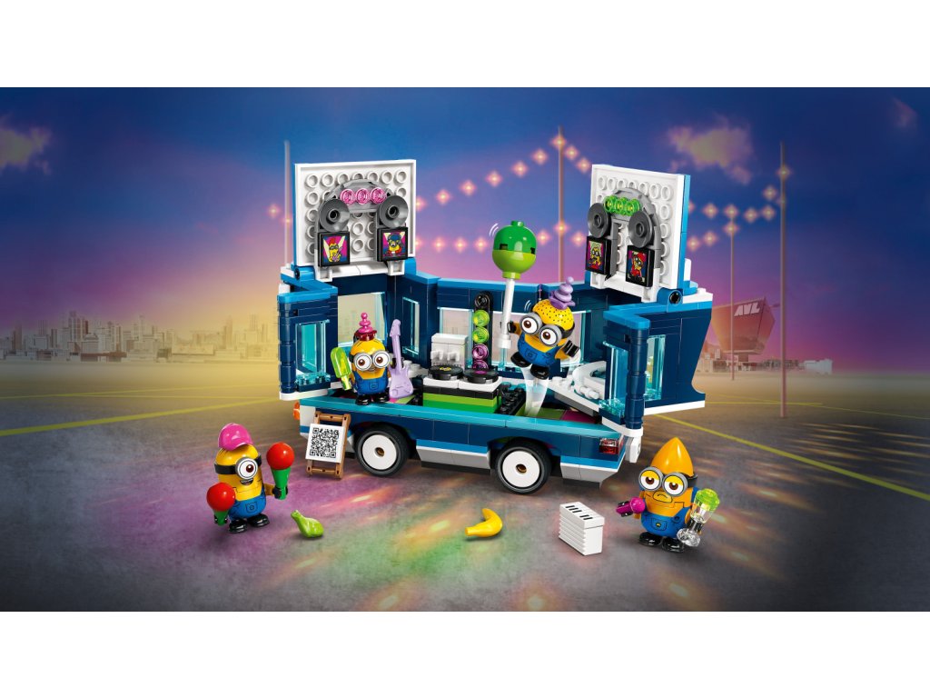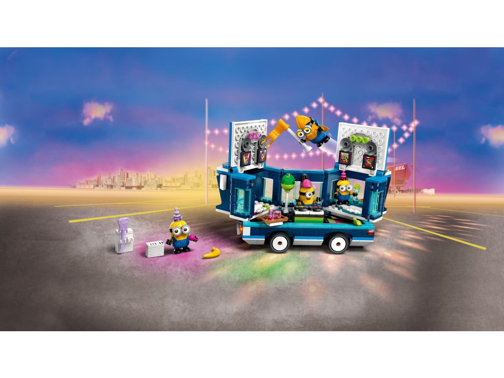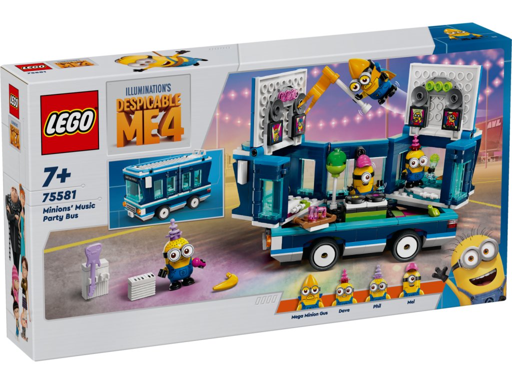 Ve stavebnici najdete 4 figurky mimoňů: Phila, Mela, Davea a létajícího mega mimoně Guse, který se poprvé objeví ve filmu Já padouch 4. Součástí autobusu je sedadlo řidiče a tyč na střeše, na kterou se zavěsí Gus. Otevřete boční strany a střechu autobusu a objevte taneční parket, mixážní pult, elektrickou kytaru, klavír, mikrofon, osvětlení, reproduktory a vířivku! Vyndejte jednotlivé prvky a pusťte se do hraní i mimo autobus. Tato zábavná stavebnice pro děti se pyšní výraznými barvami a najdete v ní úchvatné doplňky včetně vlaječky, balónku, zmrzliny, klobouků, nápojů, světel, reproduktorů a obrazovek. S aplikací LEGO Builder si děti navíc užijí digitální zábavu.