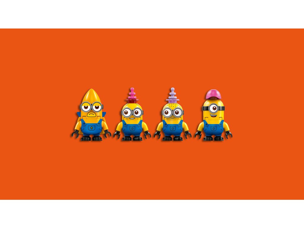 - Autobus mimoňů – Součástí je sestavitelný model autobusu, kterýlze přestavit na mobilní párty pro 4 figurky mimoňů LEGO®: Phila, Mela, Davea a létajícího mega mimoně Guse