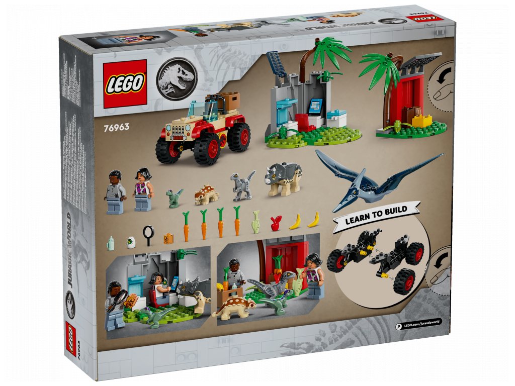 Fanoušci od 4 let si se stavebnicí Záchranářské středisko pro dinosauří mláďata (76963) užijí spoustu legrace a naučí se pečovat o malé dinosaury. Těšit se mohou také na terénní vozidlo a výzkumnou zónu s jeskyní se začátečnickými kostkami nebo na krmnou stanici. 2 minifigurky, figurky mláděte ankylosaura, triceratopse a velociraptora a figurky malého velociraptora a dospělého pteranodona zaručí, že se děti mohou ihned pustit do hraní.