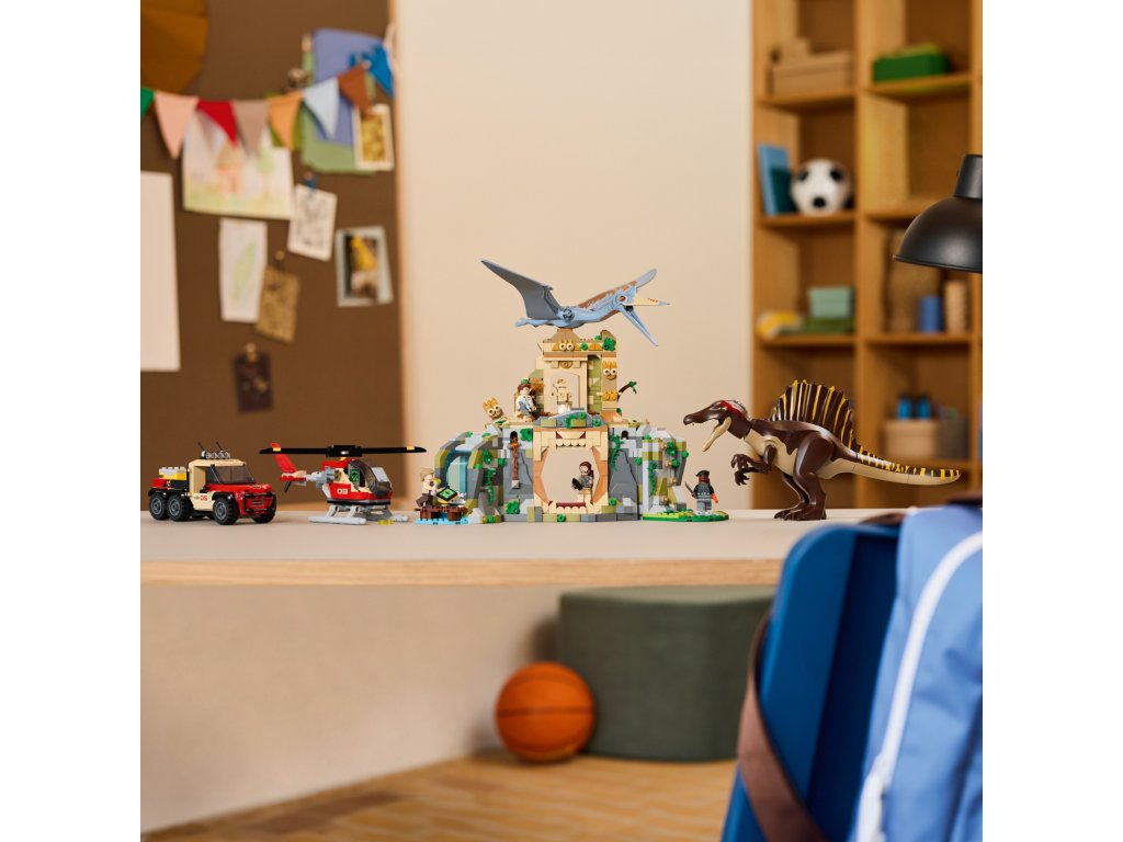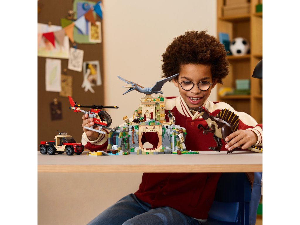 - Hračky na motivy Jurassic World: Rebirth z kostek LEGO® – Tvarované figurky spinosaura a quetzalcoatla, 4 minifigurky filmových postav, starověký chrám, helikoptéra, dinosauří náklaďák a spousta detailů