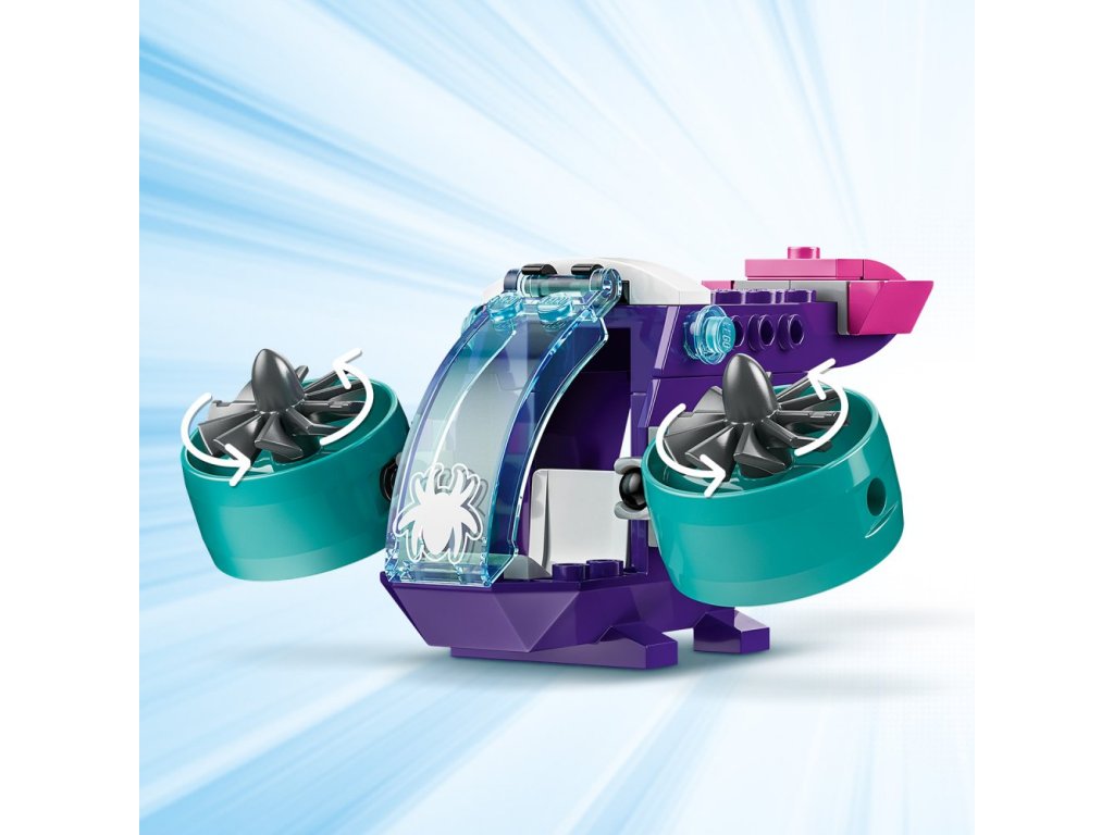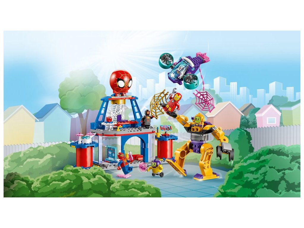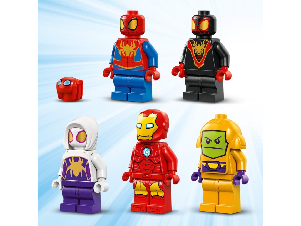 Součástí této stavebnice LEGO Marvel je minifigurka Spideyho, Iron Mana, Milese „Spin“ Moralese, Ghost-Spider a Zoly. Nechybí Zolův velký robotický oblek s pohyblivýma nohama a drápy, kterými dokáže uchopit minifigurku, kluzák s rotory a otáčivými vrtulemi, otevírací kokpit a velká růžová pavučina. V hlavní budově najdete inspirativní prvky, které odhalují zájmy superhrdinů: věda, hudba a malování.