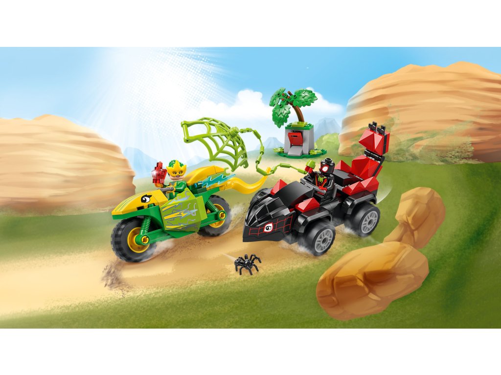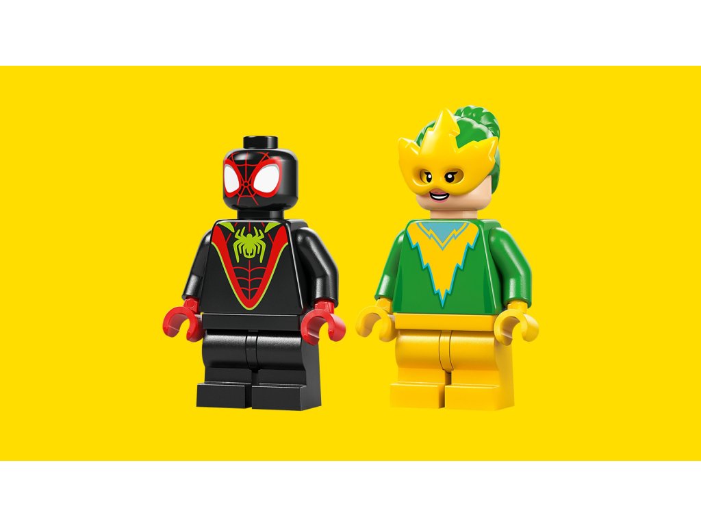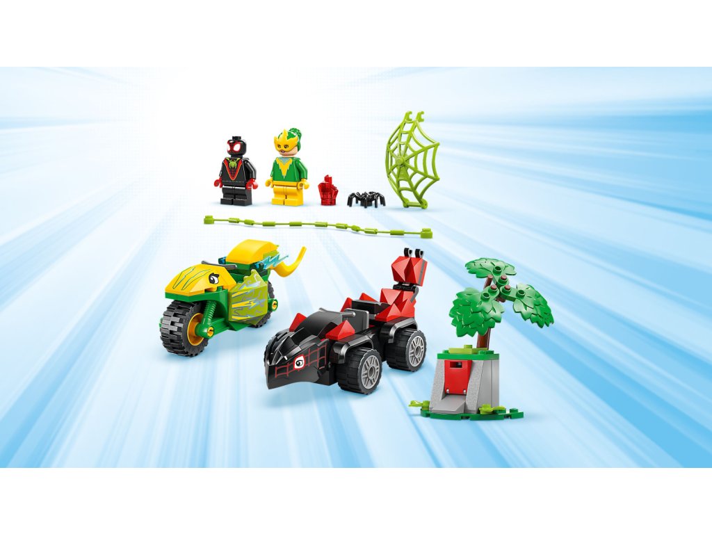 Stavebnice ztvárňuje akční scény ze série „Dino-Webs“ z televizního seriálu Spidey a jeho úžasní přátelé. Obsahuje 2 minifigurky superhrdinů a 2 tahací dinosauří vozidla: Milese „Spin“ Moralese v autě se stegosaurem a Electro na motorce s dilophosaurem. Velká pavučina, krystal ukrytý v kameni a doplňky terénu inspirují děti ke kreativnímu hraní. Uvnitř krabice najdete sáčky, které obsahují kostky a velkou začátečnickou kostku pro rychlé sestavení modelu a postavy, takže děti se můžou hned pustit do hraní. Nechybí intuitivní návod ve podobě barevného obrázkového příběhu.