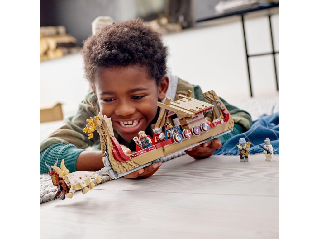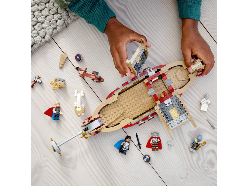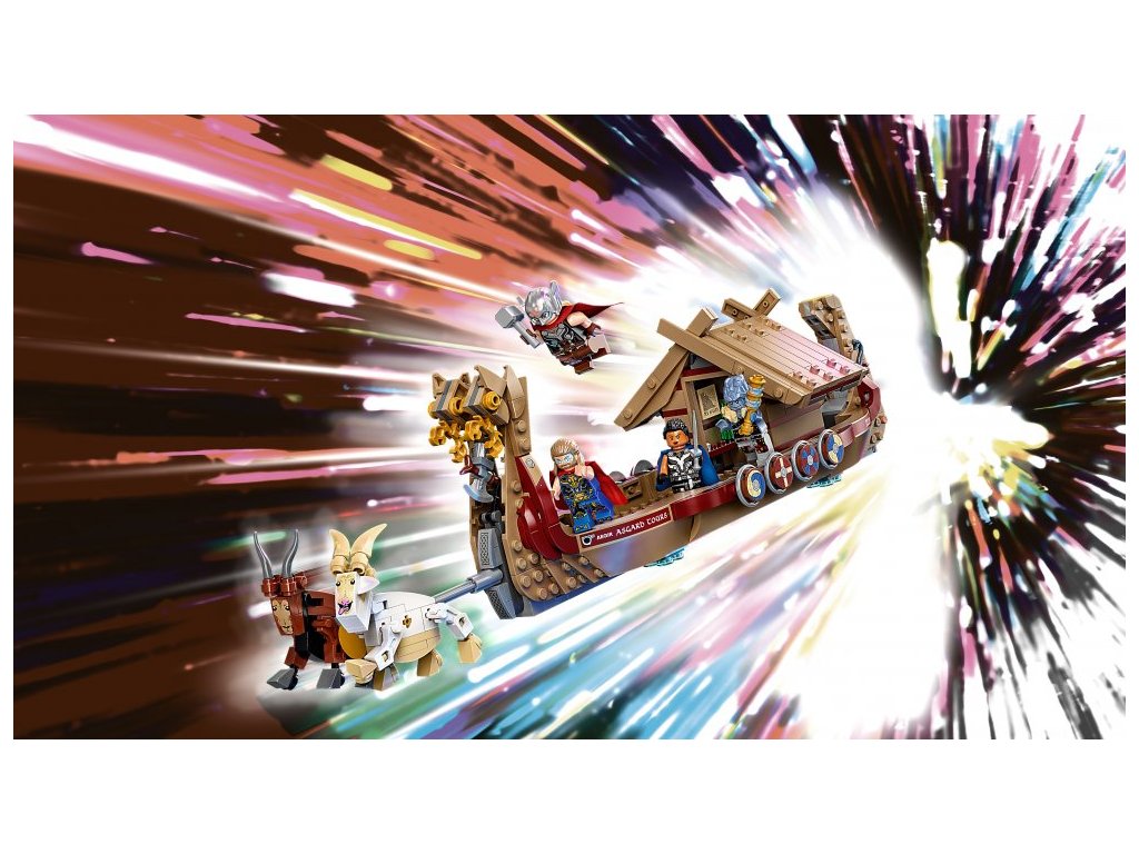 Loď po obloze táhne legendární kozí dvojice Toothgnasher a Toothgrinder, která je umístěna nad zemí, takže děti mohou s lodí při hraní pohodlně manipulovat. Stavebnice obsahuje 5 minifigurek – Thora, mocného Thora, Valkýru, Korga a Gorra – a řadu zbraní a doplňků, mezi kterými nechybí Thorova sekera Stormbreaker. Kajuta má otevírací střechu, díky čemuž děti získají přístup dovnitř. Těšit se můžete i na množství autentických doplňků pro ještě nápaditější hraní, jako lodní klíč, hasicí přístroj, mapu Nového Asgardu, láhev a sluneční krystal. Až budou všechna superhrdinská dobrodružství u konce, mohou si děti model lodi vystavit v pokojíčku. A pokud máte chuť zažít ještě větší porci stavitelské zábavy, v bezplatné aplikaci LEGO s návody na stavění najdete intuitivní digitální nástroje umožňující otáčení a přibližování modelů.