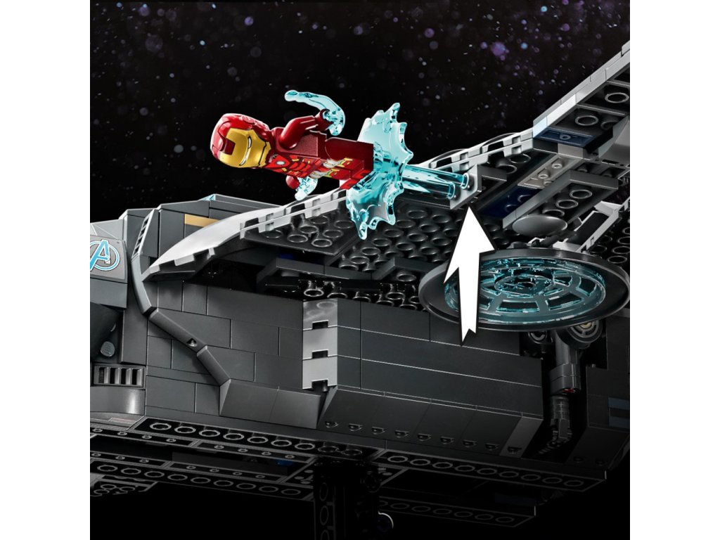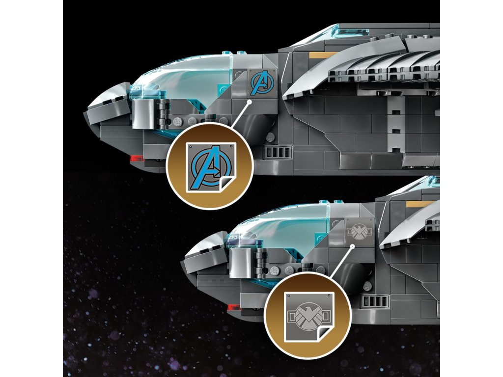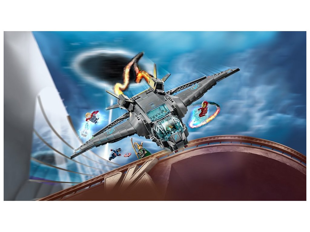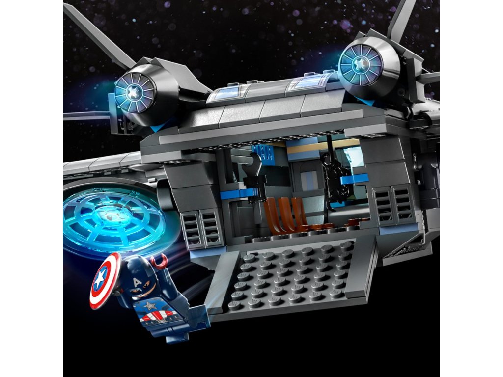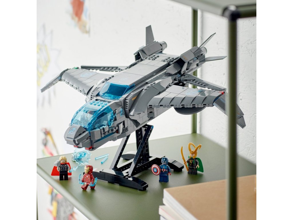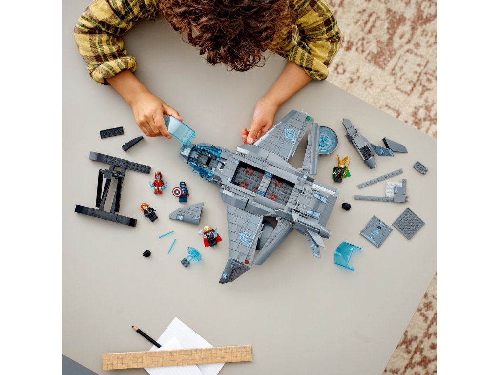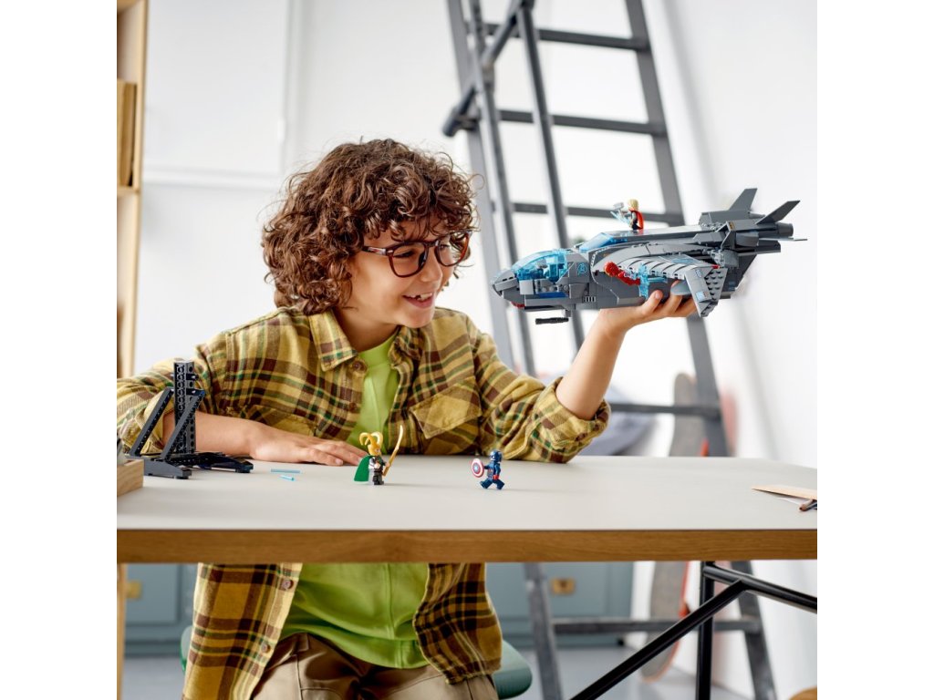 Tato propracovaná replika slavné stíhačky Quinjet z filmové série Avengers studia Marvel potěší otevíracím kokpitem, prostorem pro pasažéry a zadním oddílem. Dále nechybí zatahovací podvozek a nastavitelná křídla.Součástí je také řada doplňků a 5 ikonických minifigurek: Black Widow, Thor se svým kladivem, Iron Man, Captain America se svým štítem a Loki se svým žezlem. Děti mají na výběr ze 2 archů se samolepkami, takže si loď Quinjet mohou ozdobit buď nápisem Avengers, nebo S.H.I.E.L.D. Když model zrovna nebude děti inspirovat k nekončícím kreativním dobrodružstvím, bude se skvěle vyjímat na výstavce v každém dětském pokojíčku. Pro ještě více digitální zábavy je zde aplikace LEGO Builder s intuitivními nástroji přibližování a otáčení, které dětem umožní vizualizovat si model, zatímco na něm pracují.