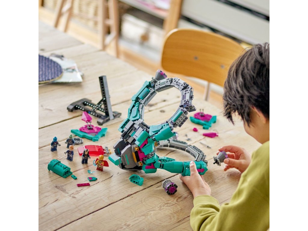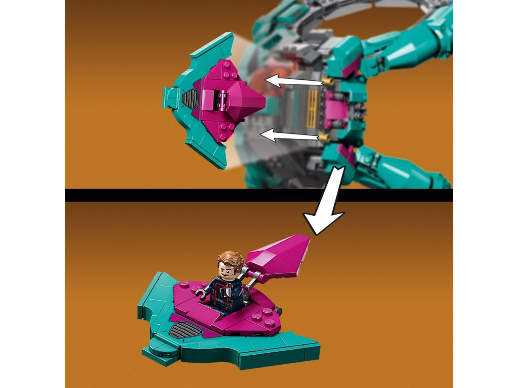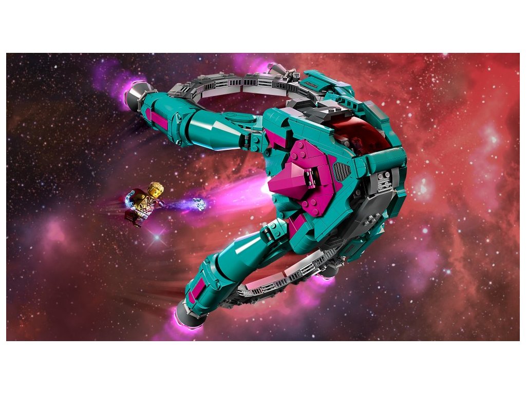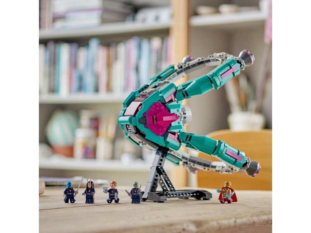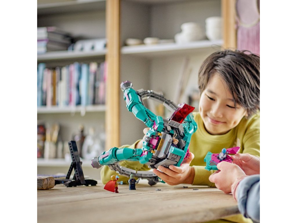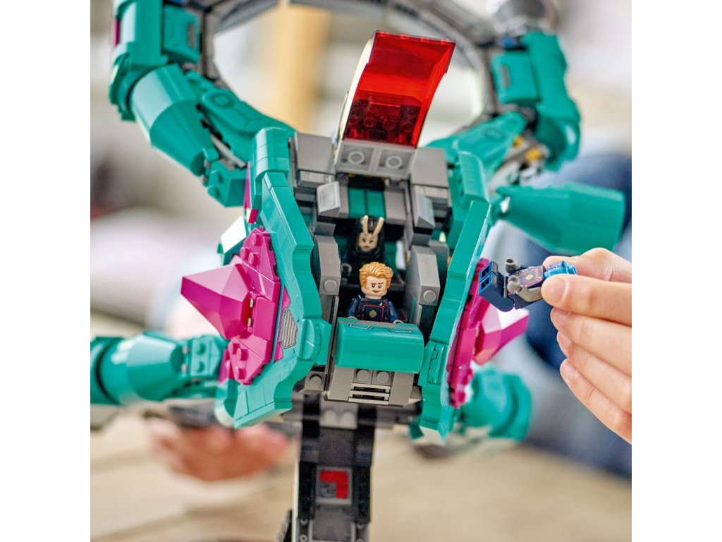 Tato sestavitelná vesmírná loď je přesně tak úžasná, jak vypadá. Součástí je otevírací kokpit s prostorem pro 3 minifigurky, tajný prostor pro další minifigurku, úložný prostor pro zbraně a doplňky a 2 malé vesmírné lodě, které lze oddělit od mateřské lodě. Nechybí 5 minifigurek z filmu: Mantis, Drax, Star-Lord, Nebula a Adam Warlock. Loď můžete snadno zvednout a „prosvištět“ s ní vesmírem. Jakmile akce skončí, loď lze odložit na podstavec, na kterém vypadá skutečně úchvatně v jakémkoli dětském pokoji. Děti mohou používat aplikaci LEGO Builder, v níž je možné přibližovat a otáčet modely ve 3D, ukládat stavebnice a sledovat postup.